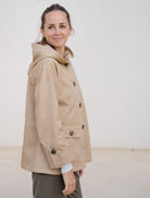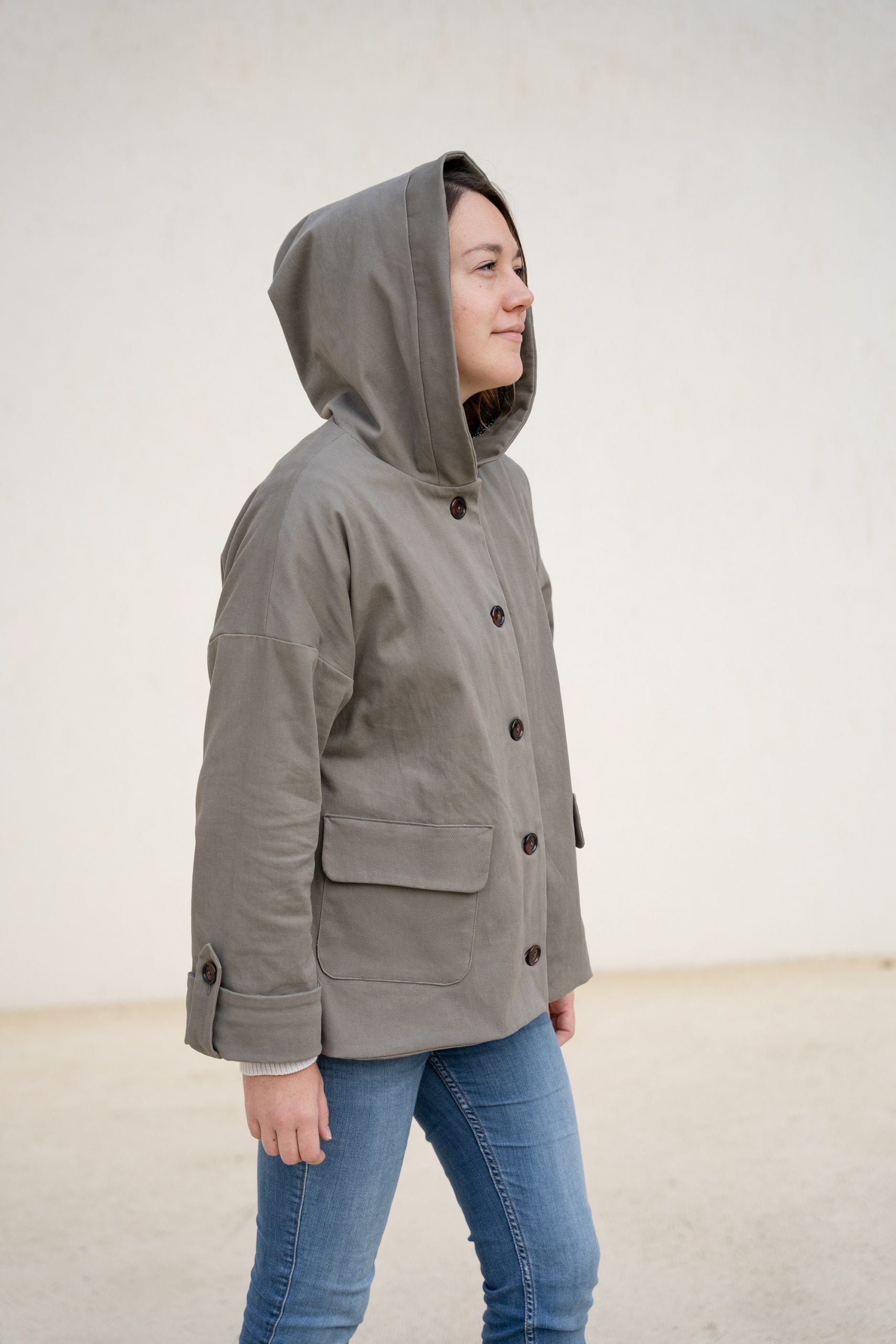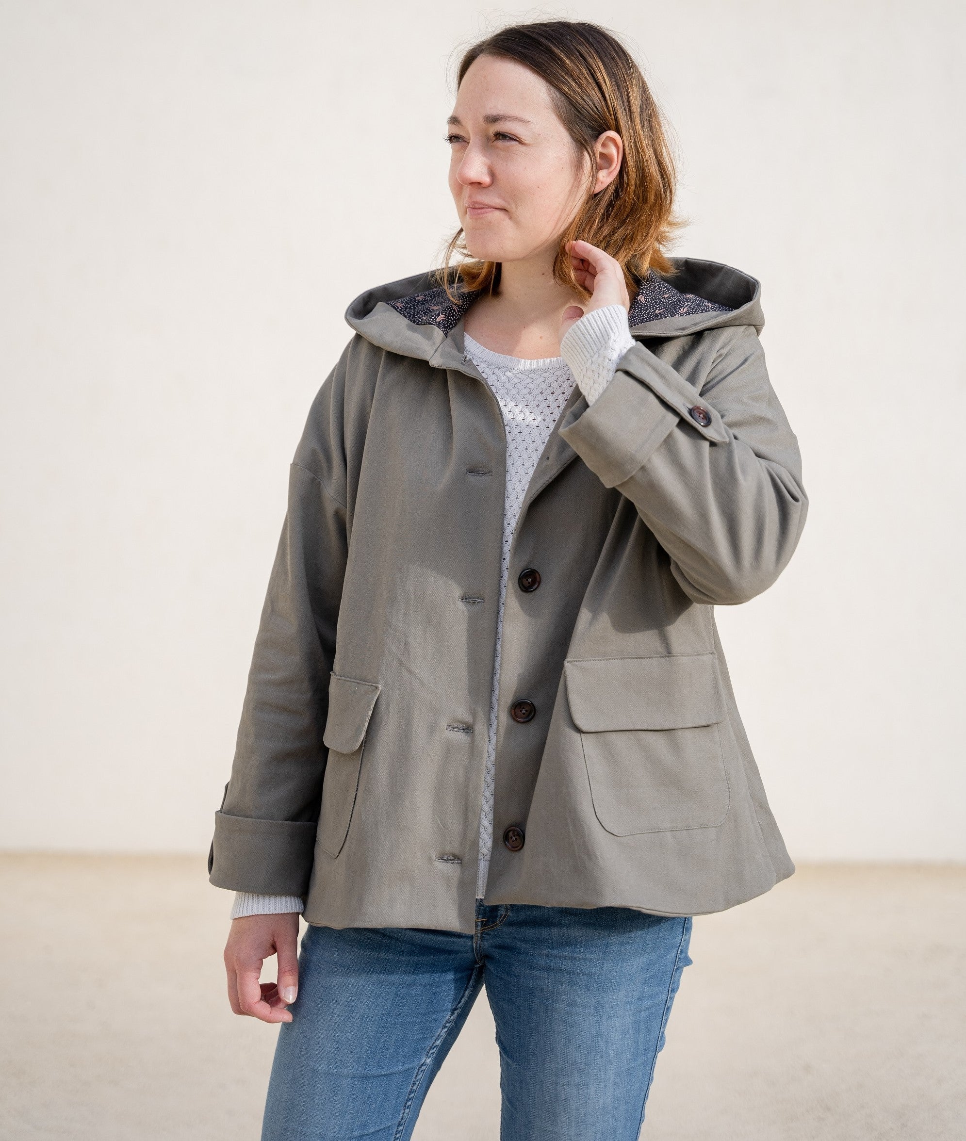 Eurydice est un manteau au look épuré à mi-chemin entre le caban, le trench et le ciré. Il se ferme grâce à de gros boutons qui impriment le design. Il possède de grandes poches plaquées sur le devant dont le rabat pourra être boutonné ou non. Il est également possible de se passer des rabats de poche. La touche d’originalité se trouve au bas des manches qui présentent un large revers et une patte boutonnée. Les manches larges et tombantes donnent un maximum d’aisance à ce manteau mi-long. Vous pourrez coudre Eurydice avec ou sans capuche. Ce modèle est entièrement doublé.