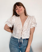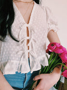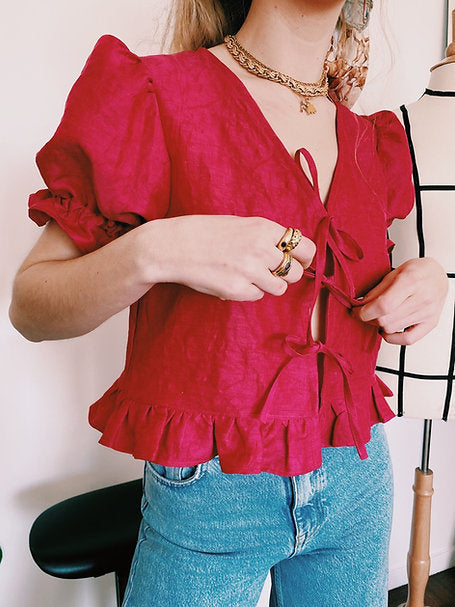 Elle se caractérise par une encolure V et des manches bouffantes volantées resserrées par un élastique. Rose se ferme par trois nœuds délicats sur l'avant qu'il est possible de doubler d'une sous patte pour cacher la peau. Un volant tombant sur la taille finit cette petite blouse légère, parfaite pour le printemps.