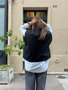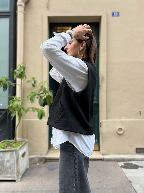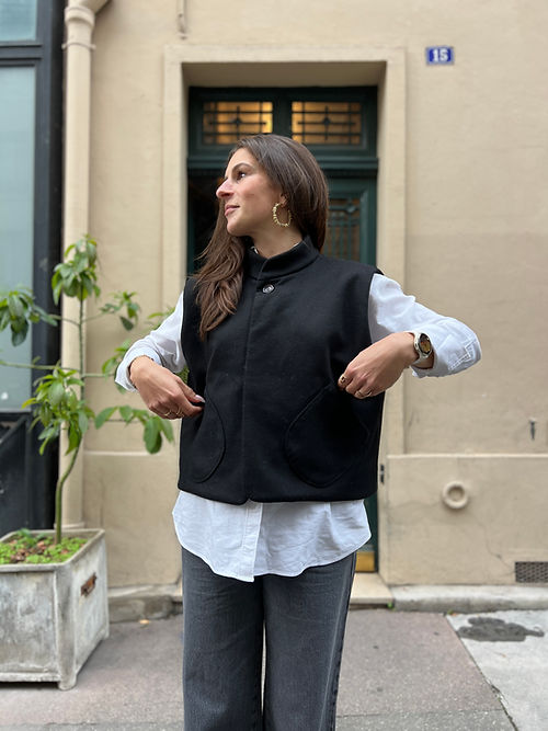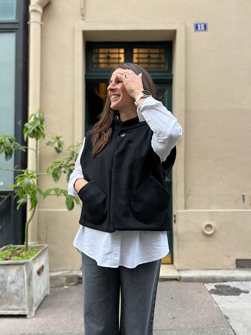 Jodie est un blouson sans manches entièrement doublée, à col officier et patte de boutonnage cachée ; il possède des poches plaquées et les finitions d’ourlets sont légèrement arrondis. Il tombe au niveau des petites hanches pour une stature d'1m68.
