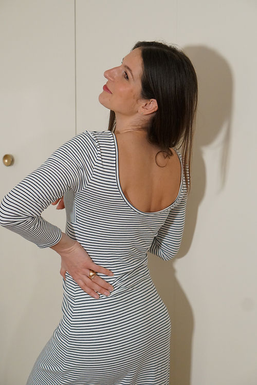 Pour la robe Leslie, vous aurez besoin d’une matière de 40 - 50 % d’élasticité, de poids léger à moyen (jusqu’à 250 g/m2). Si vous prenez une matière plus élastique, veillez à sous-tailler le modèle !