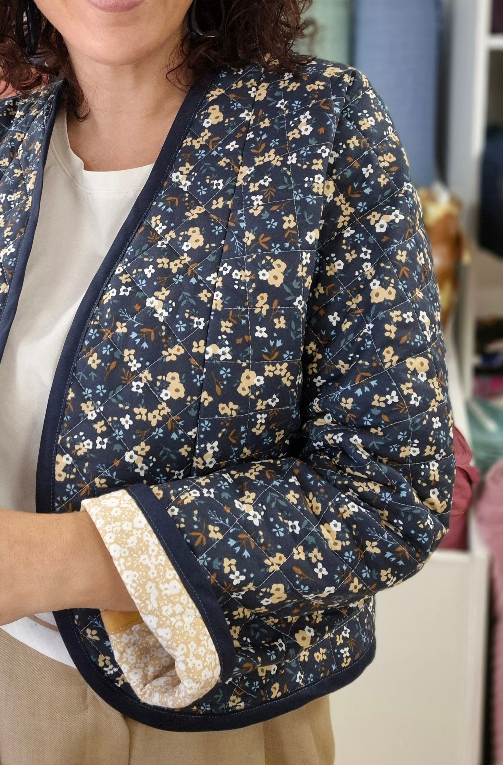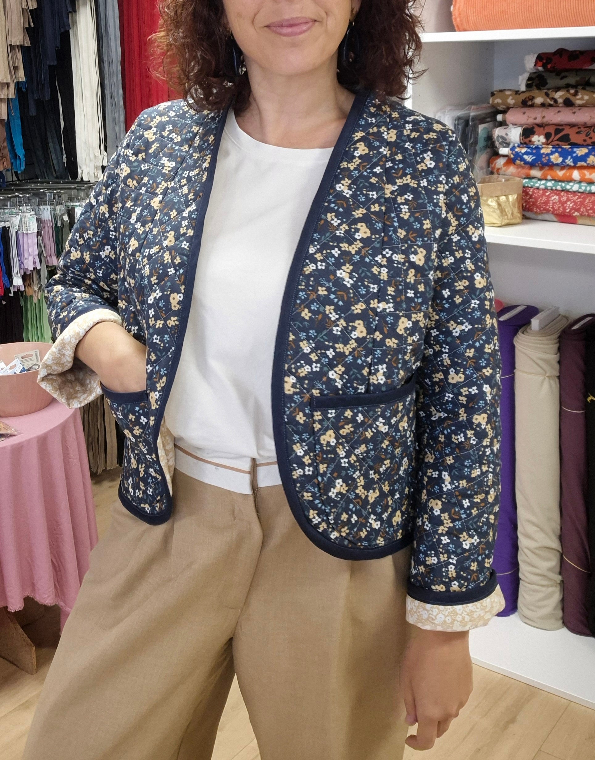 👉 Les finitions en biais contrasté soulignent joliment la ligne de la veste et mettent en valeur les détails du matelassage.