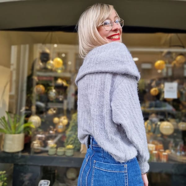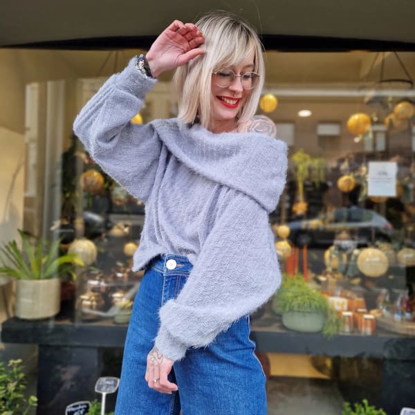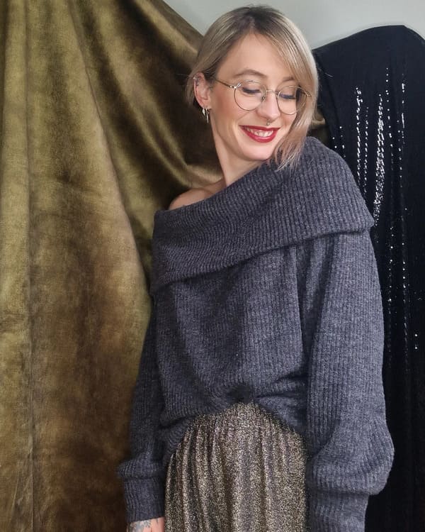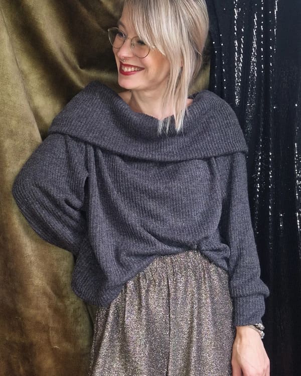 Le pull de Brigitte, avec son col bardot, est oversize, ce qui le rend plus moderne et plus tendance.