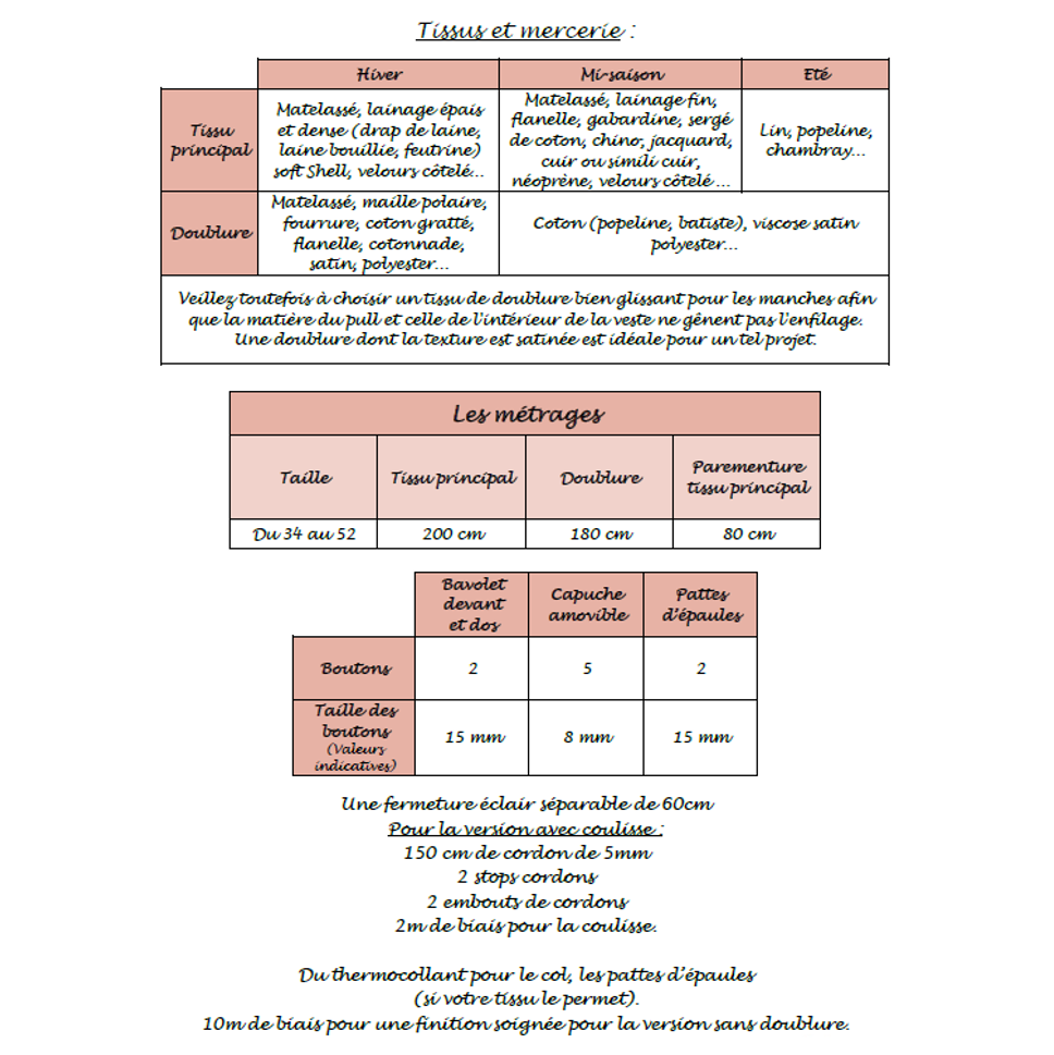 Pour vous accompagner dans votre projet, nous avons sélectionné les tissus et la mercerie adaptés à ce patron. Vous pouvez les retrouver dans "Complétez le pack couture".