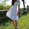 Tu peux réaliser ta robe dans un taffetas, une gabardine, une broderie anglaise et autres tissus ayant un beau tombé pour faciliter la tenue des festons, si tu veux utiliser un coton, un chambray ou autre matière plus souple n’hésite pas à thermocoller les enformes de tes festons pour qu’ils aient de la tenue.