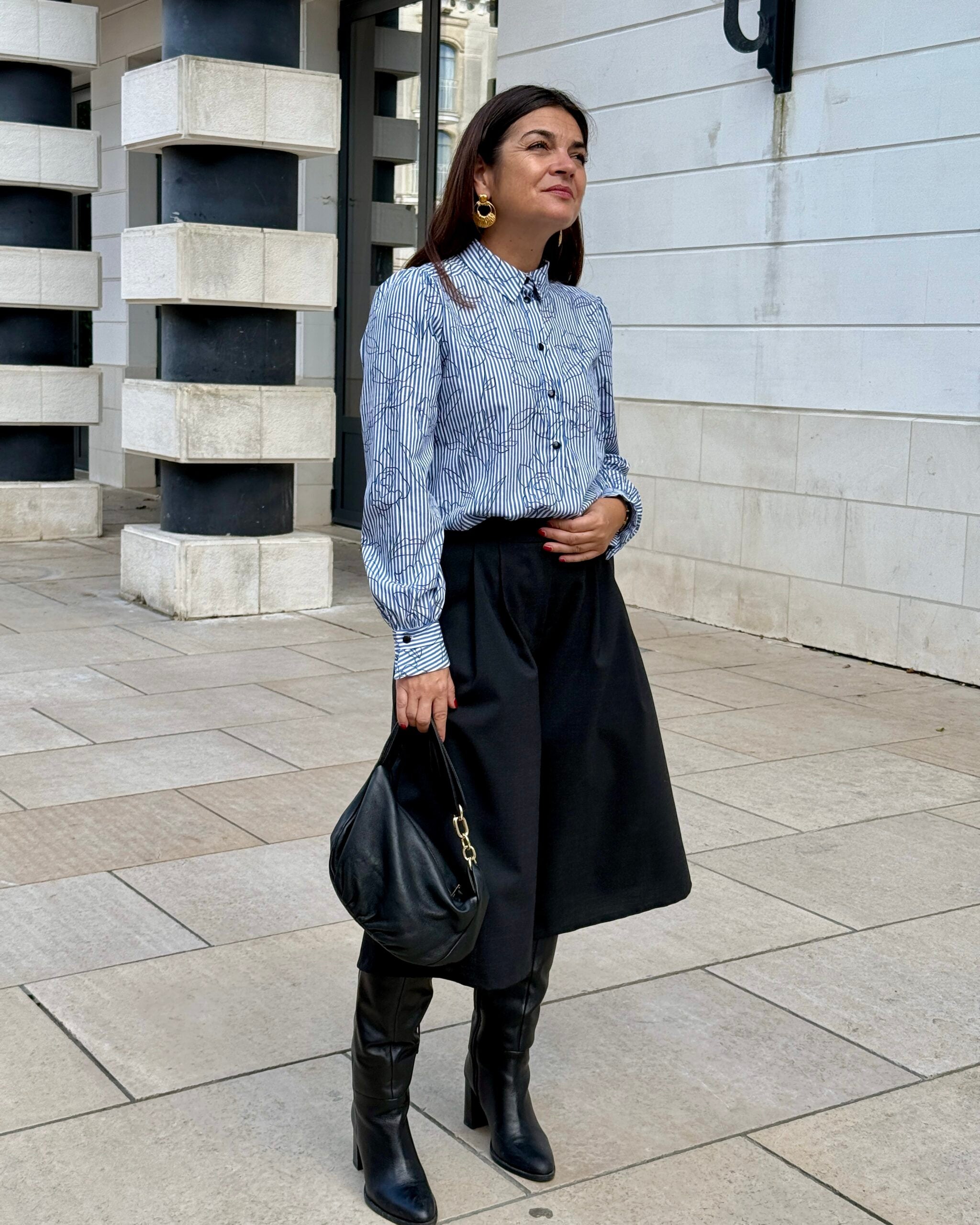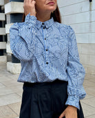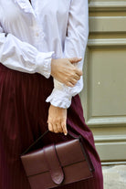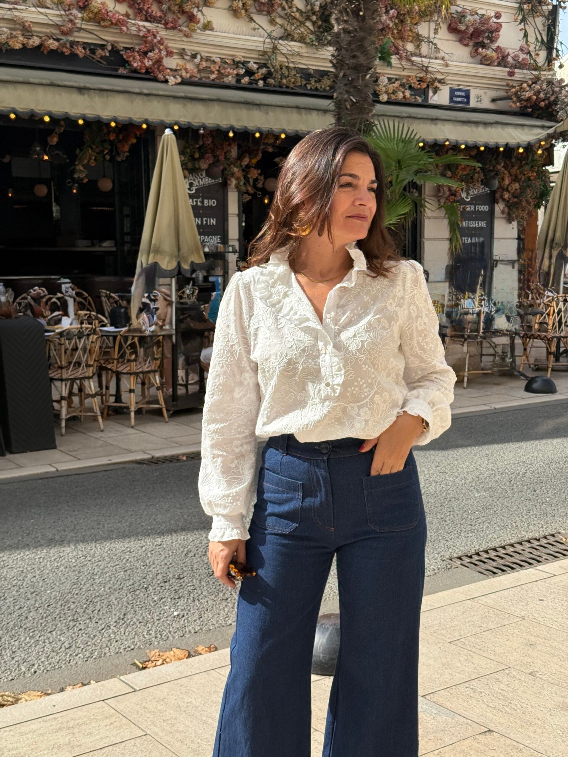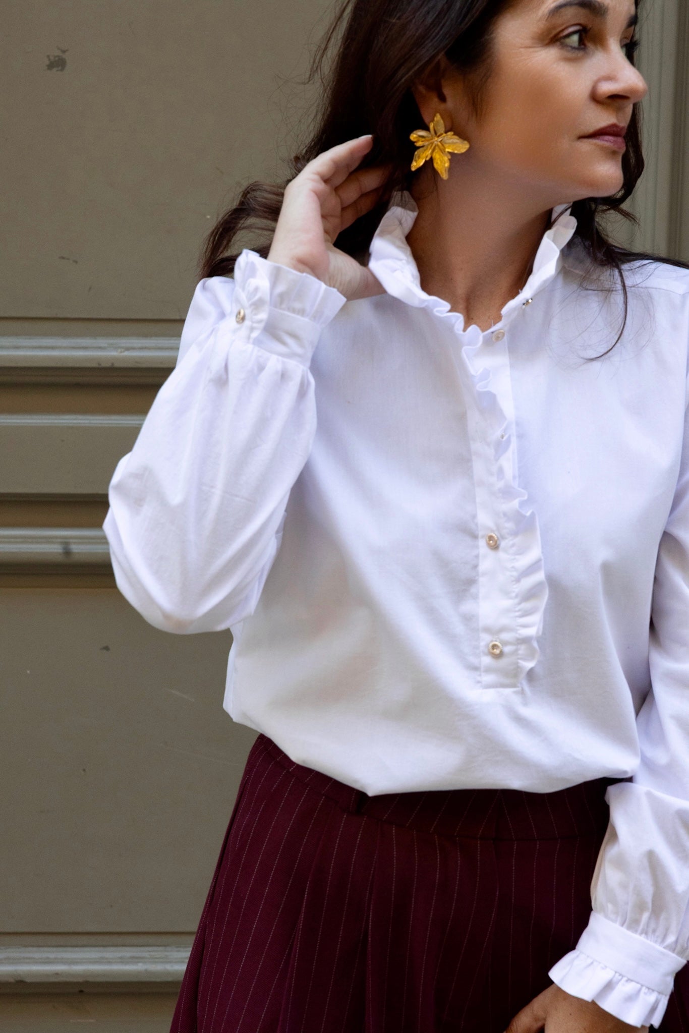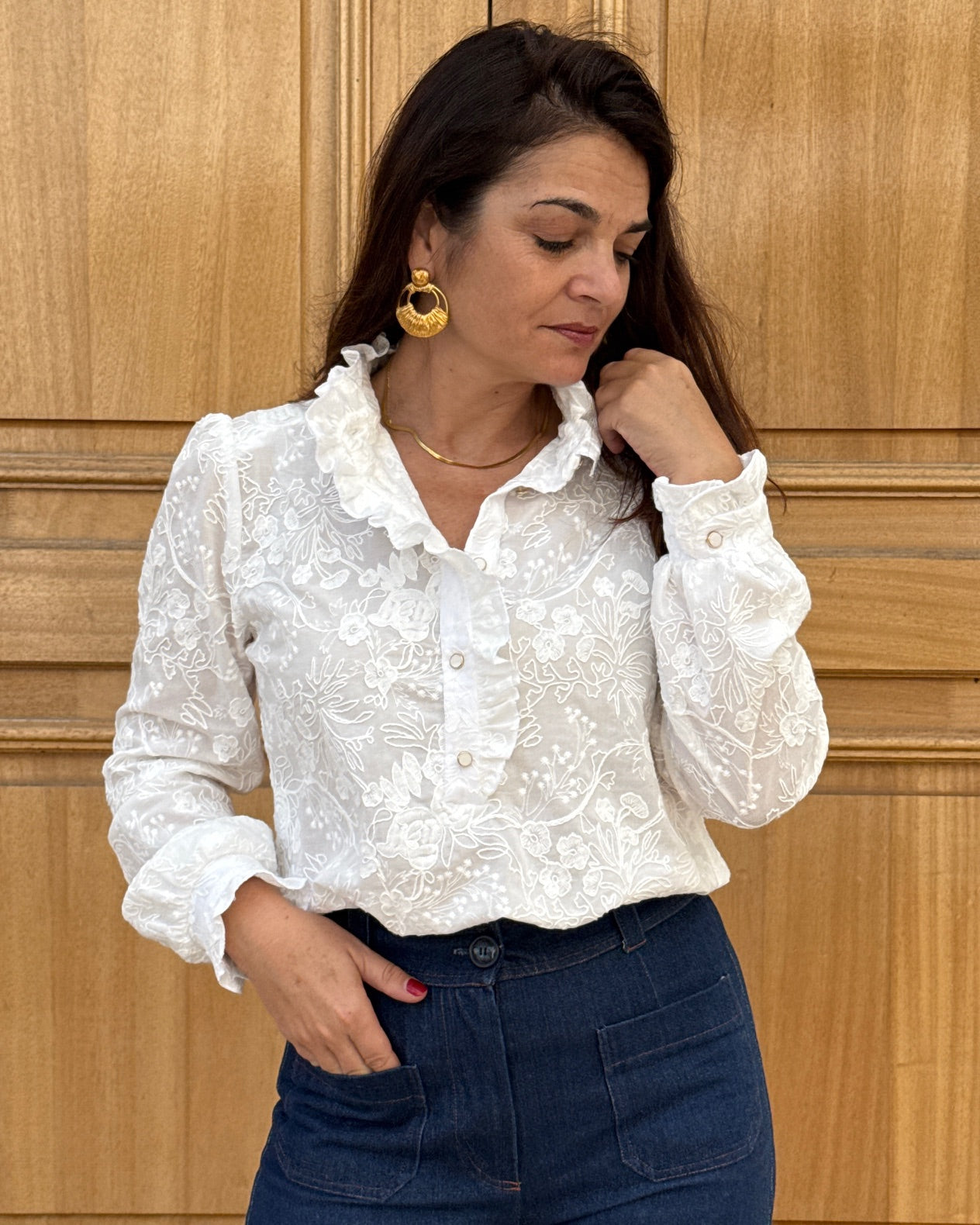 Le patron Albane se distingue par son col volanté qui court le long de la patte de boutonnage, soulignant avec délicatesse son esprit bohème.
