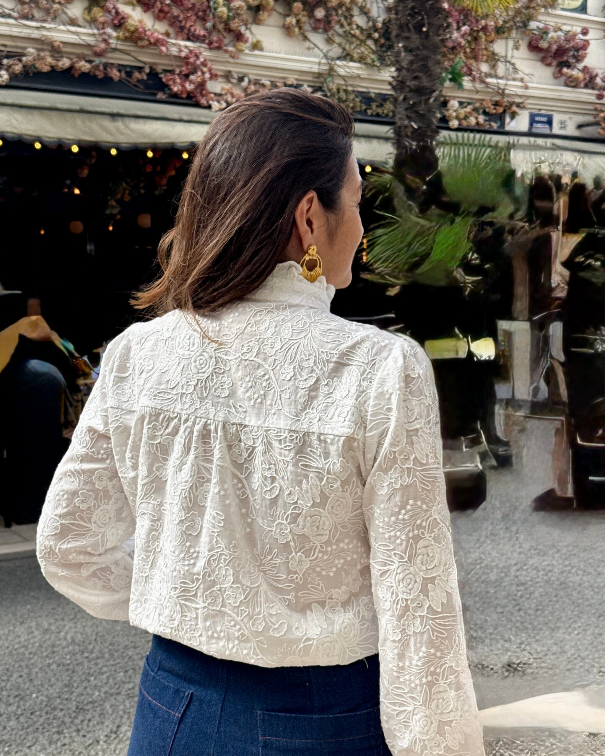Sa coupe droite, à peine cintrée, met en valeur le volume des manches légèrement bouffantes, tandis qu’aux poignets de délicats volants croisés viennent parfaire la finition raffinée.