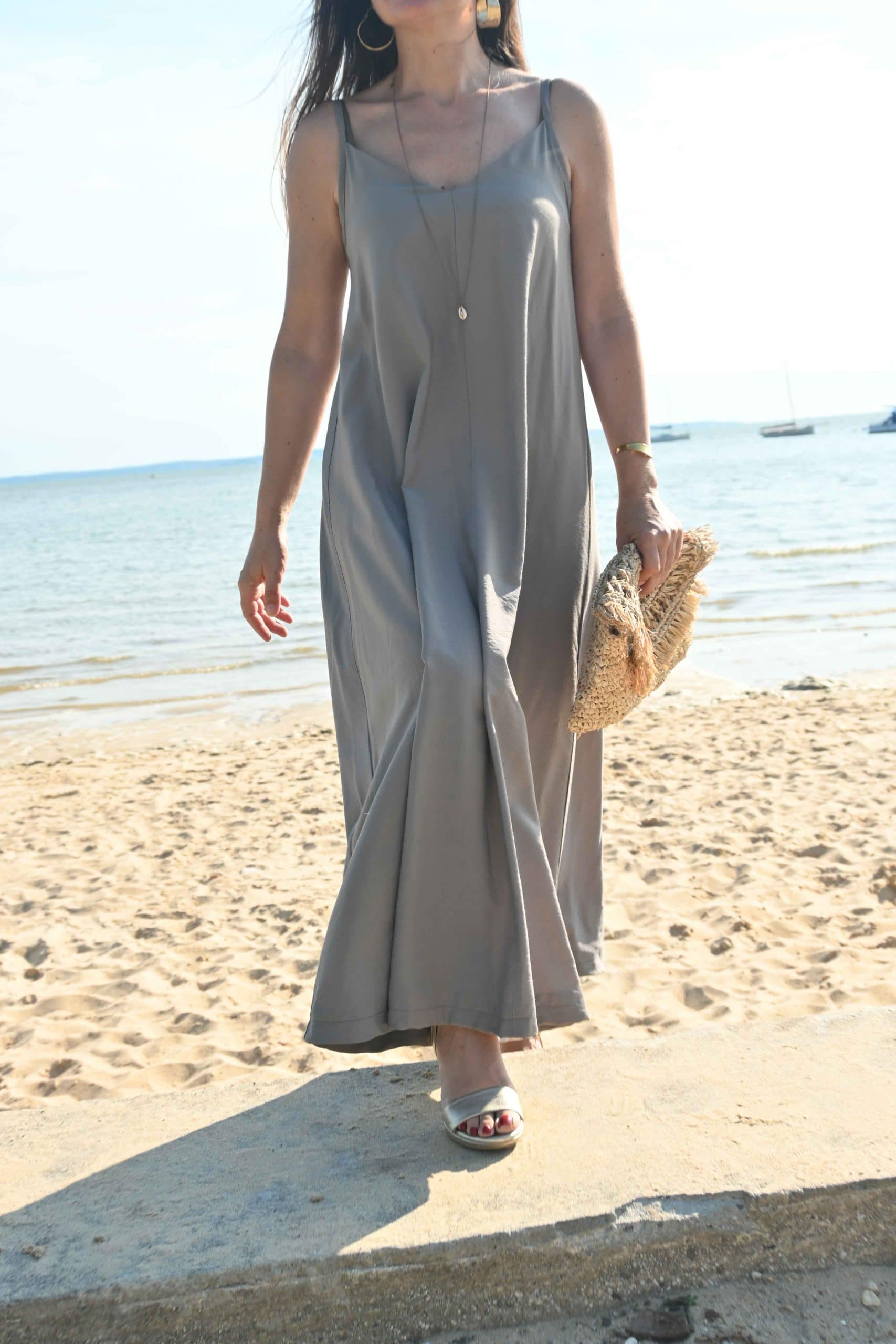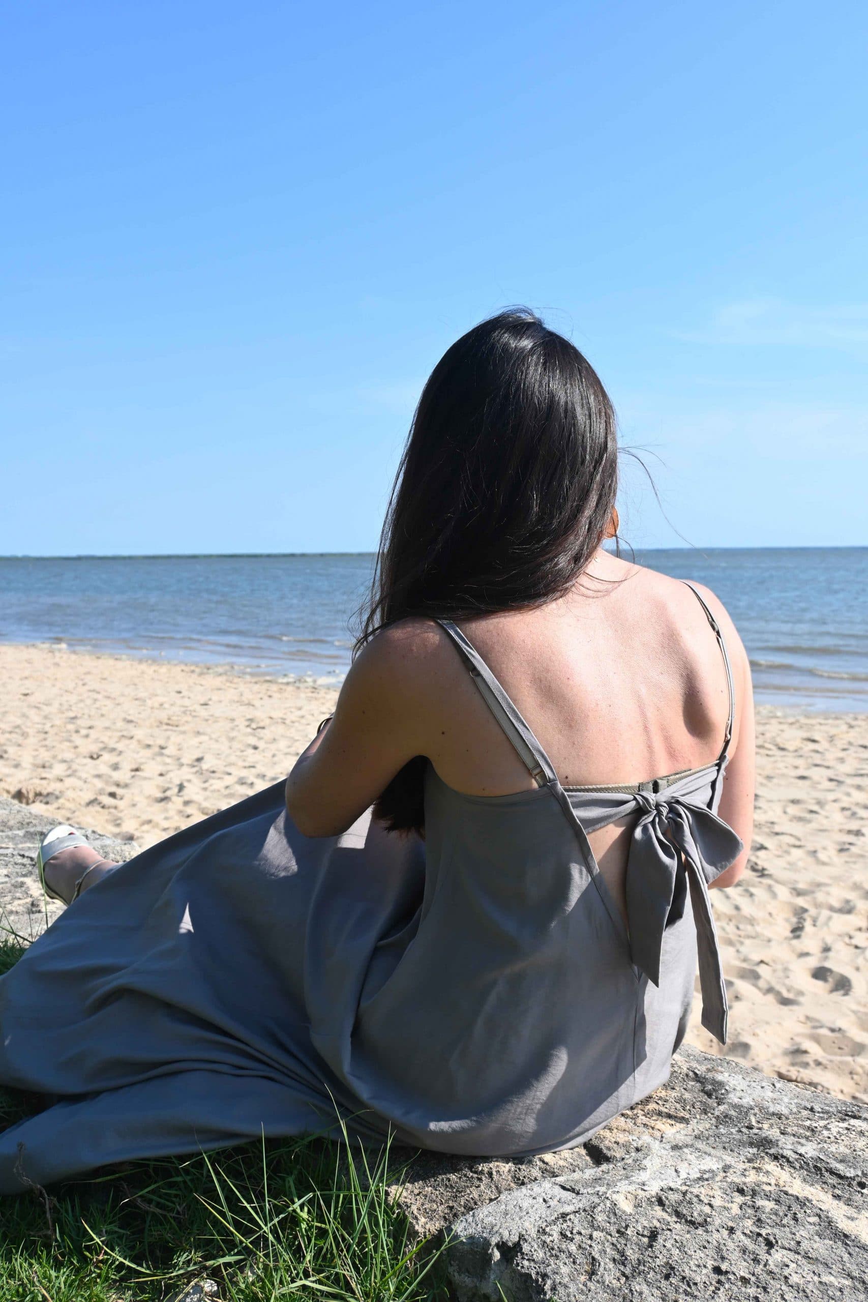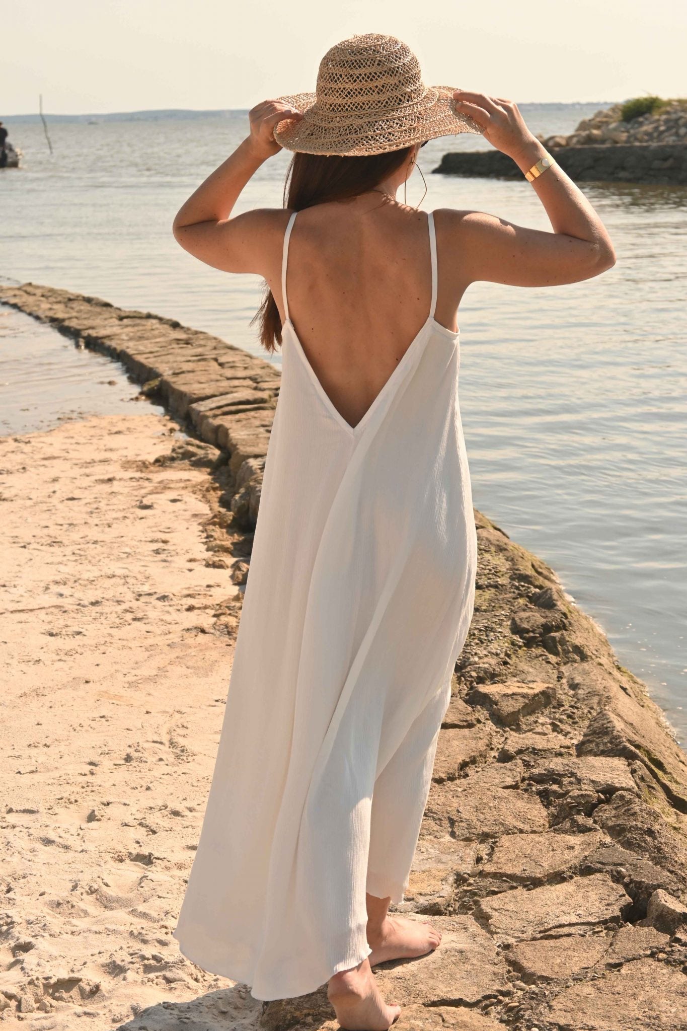 Au doux nom inspiré des Tamaris bordant les plages de mon petit village du Bassin d’Arcachon, Tamara est l’incontournable robe dos nu de l’été.