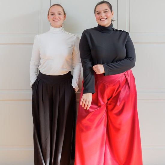 Le charme de Sanaz réside dans ses jambes extra-larges, structurées par des plis plats qui offrent un volume spectaculaire tout en préservant la fluidité. Cette coupe généreuse sublime les mouvements et crée une silhouette à la fois audacieuse et aérienne.