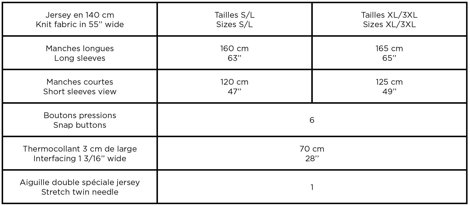 Pour ce modèle, vous devez impérativement utiliser un tissu en jersey. Poids : 150-300 gr/m2, 4,5-8 oz/y2