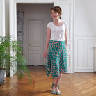 La jupe Janis peut fonctionner avec beaucoup de tissus différents. La fluidité du tissu impactera beaucoup le tombé de la jupe et notamment pour la version A, asymétrique, les tissus souples et fluides seront particulièrement adaptés. Dans tous les cas, vous pouvez choisir de la viscose, de la soie, du coton…