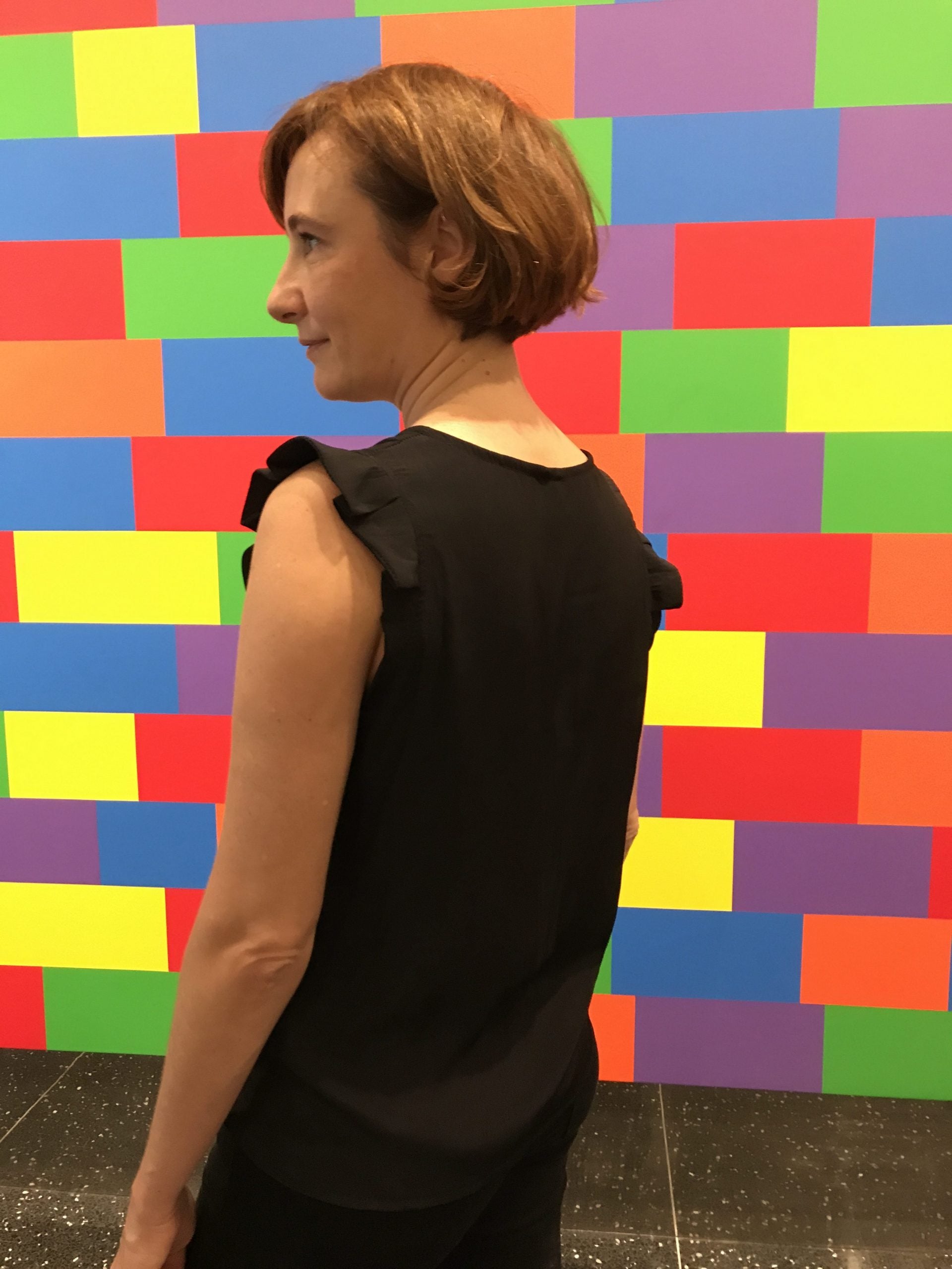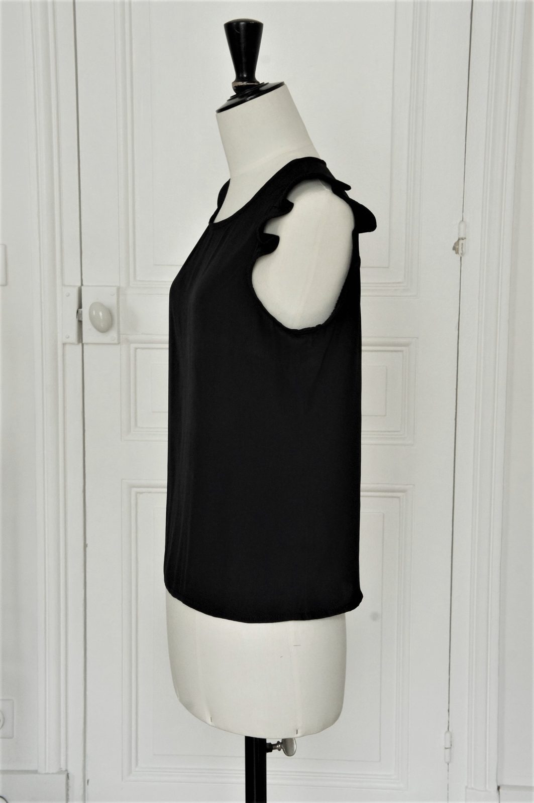 Ce top tout simple avec sa coupe droite et son encolure arrondie est très féminin grâce aux volants sur l’emmanchure. Et pour changer des fronces habituelles, le volume du volant est donné par deux plis à l’avant et deux à l’arrière.