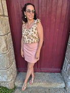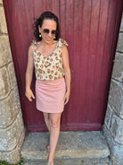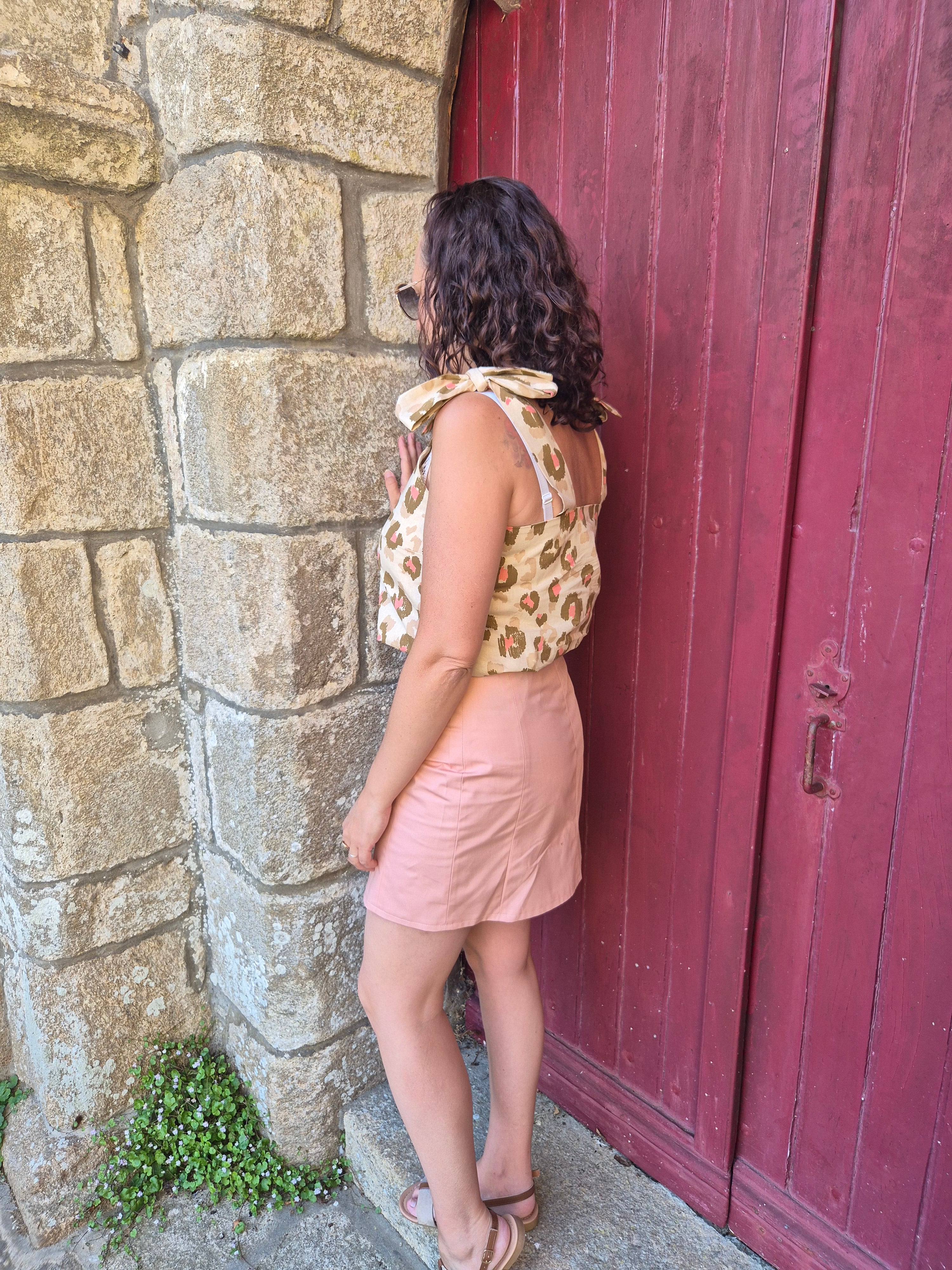 Pour le haut, nous avons opté pour le top Emmelina, cousu dans un coton imprimé léopard aux tons lin et rose. Les bretelles à nouer ajoutent une touche délicate et ludique, parfaite pour jouer avec les détails et personnaliser son look.