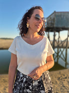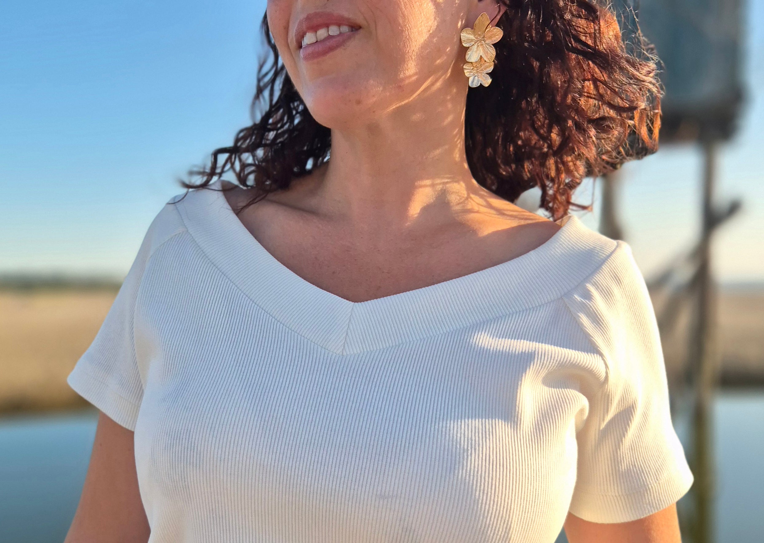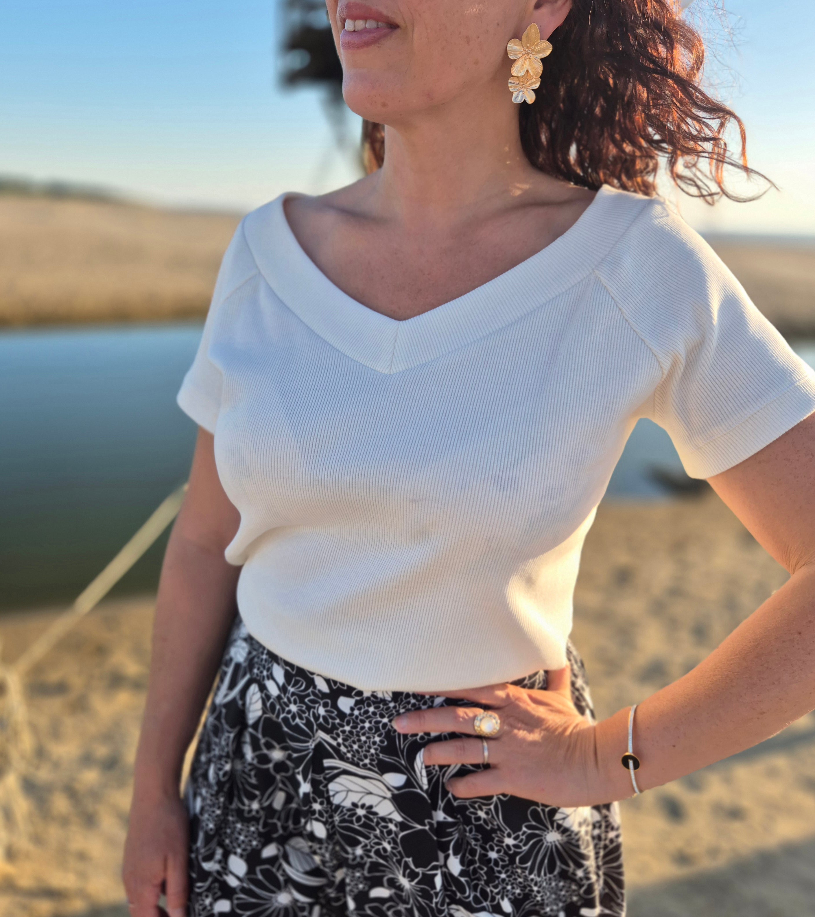 👚 Le tee-shirt Ehola – imaginé par Coralie Bijasson – vient compléter la silhouette avec modernité. Cousu dans un jersey côtelé tout doux, il apporte confort et élégance grâce à sa coupe féminine et ajustée. Polyvalent, il se marie aussi bien avec des jupes que des pantalons ou des shorts.
