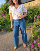 Le pantalon Fiteasy’m de Clématisse Pattern, cousu dans un denim clair, offre une coupe moderne et décontractée. Il est associé au chemisier Nina de Nine Patrons de Couture, réalisé dans une popeline de coton aux motifs citrons pour une note de fantaisie estivale.