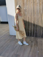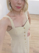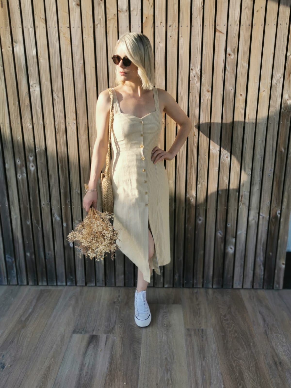 Son boutonnage sur le devant, sa coupe ajustée et ses fines bretelles créent une silhouette élégante et facile à porter au quotidien comme pour des occasions spéciales.