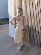Craquez pour la robe Rita, une pièce pleine de charme cousue par Valérie dans un superbe coton viscose à rayures jaunes. Son tissu léger et légèrement transparent apporte une allure aérienne et féminine, tout en étant doublé pour plus de confort et d’opacité.