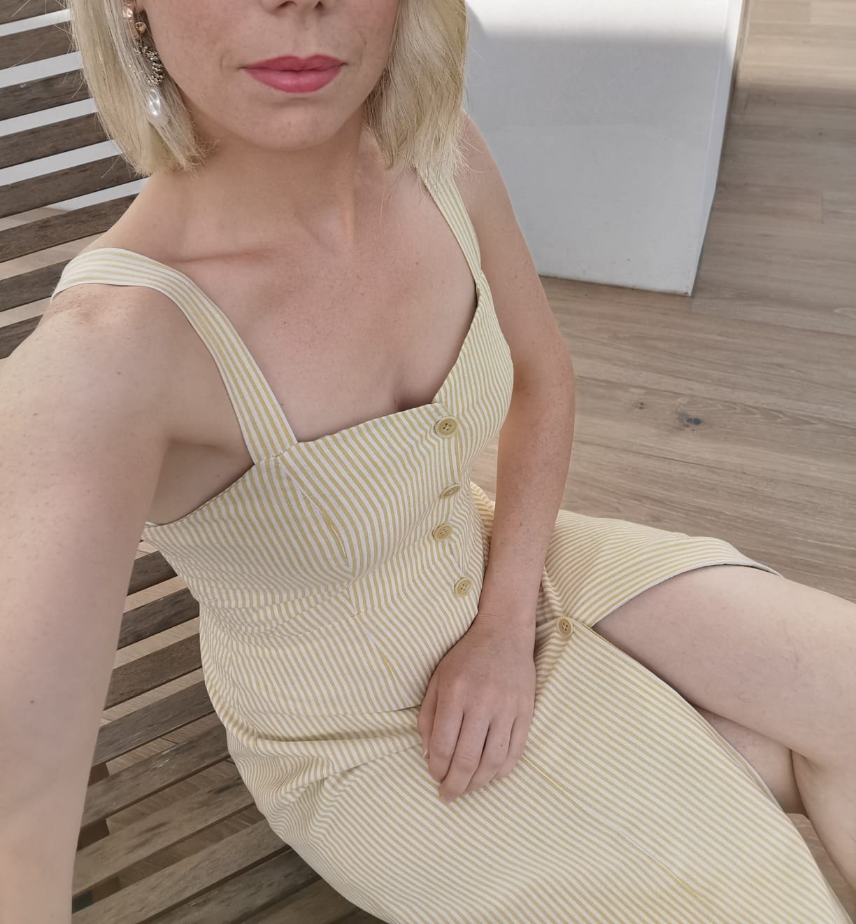 Le charme de la robe Rita est à votre portée ! Retrouvez en boutique le coton viscose à rayures jaunes utilisé par Valérie, et le patron, en PDF avec possibilité d'impression en A0.