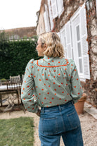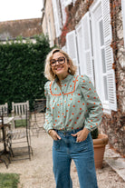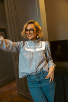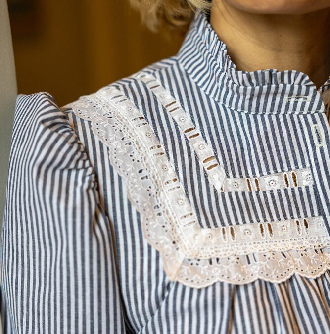 Tessa est une chemise droite, froncée au niveau des empiècements devant et dos, joliment agrémentés de galons, surmontés d’un col mao avec volant qui offre une alternative contemporaine au col classique.