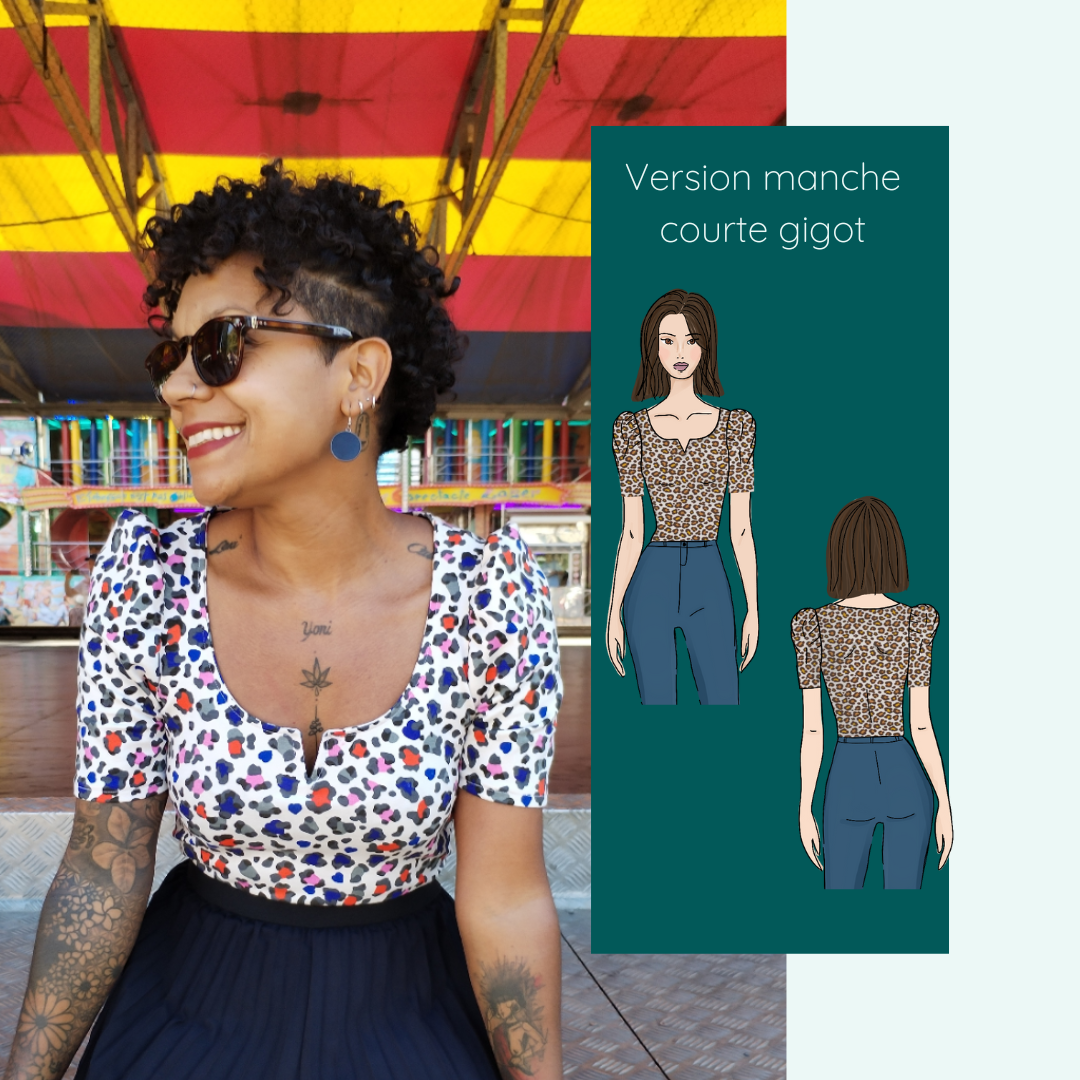 Le Top Impala est un haut en maille à la fois très agréable à porter et féminin à souhait. Ce top est près du corps et épouse les formes. Le charme de ce modèle réside dans son décolleté. Ce dernier est très arrondi puis se termine en pointe. Vous avez la possibilité de coudre ce top en version débardeur, manches courtes ou longues, classiques ou gigot.
