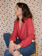 Myrtil est un modèle de blouse loose. Son drapé croisé et son petit col à même arrondi lui confèrent un style inspiré des années 80.