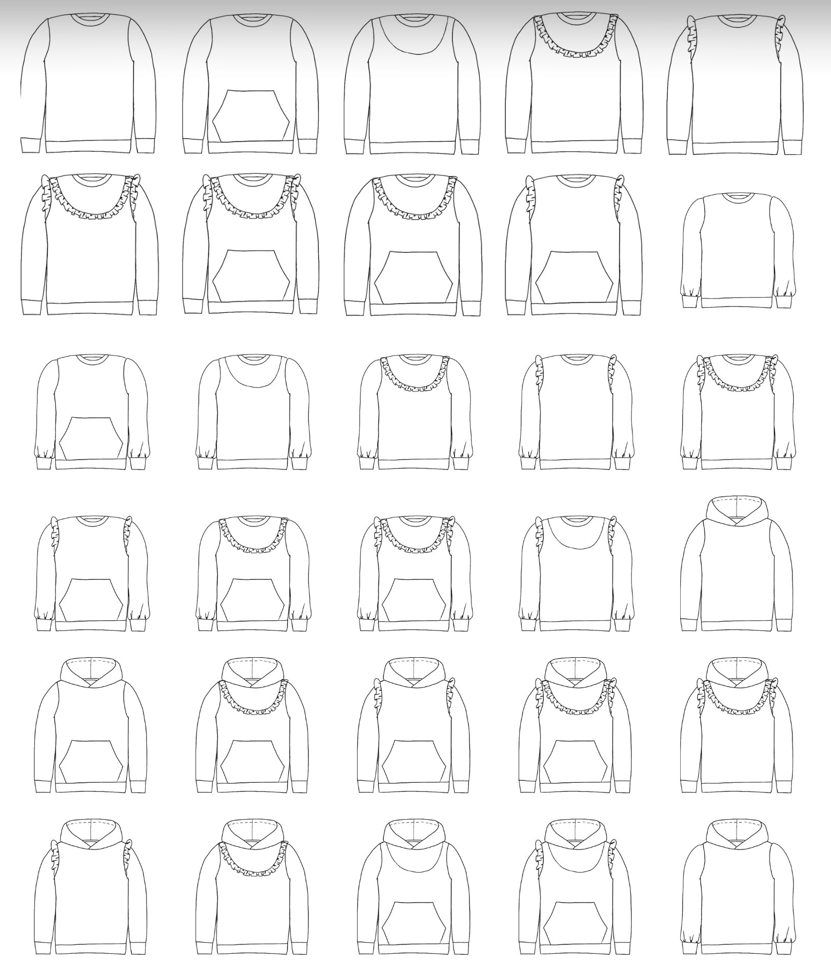Ce patron est conçu pour être assemblé à la surjeteuse. Les piqures décoratives (poche et capuche) sont réalisées à la machine à coudre. Cependant il est tout à fait possible de le coudre entièrement à la machine à coudre.