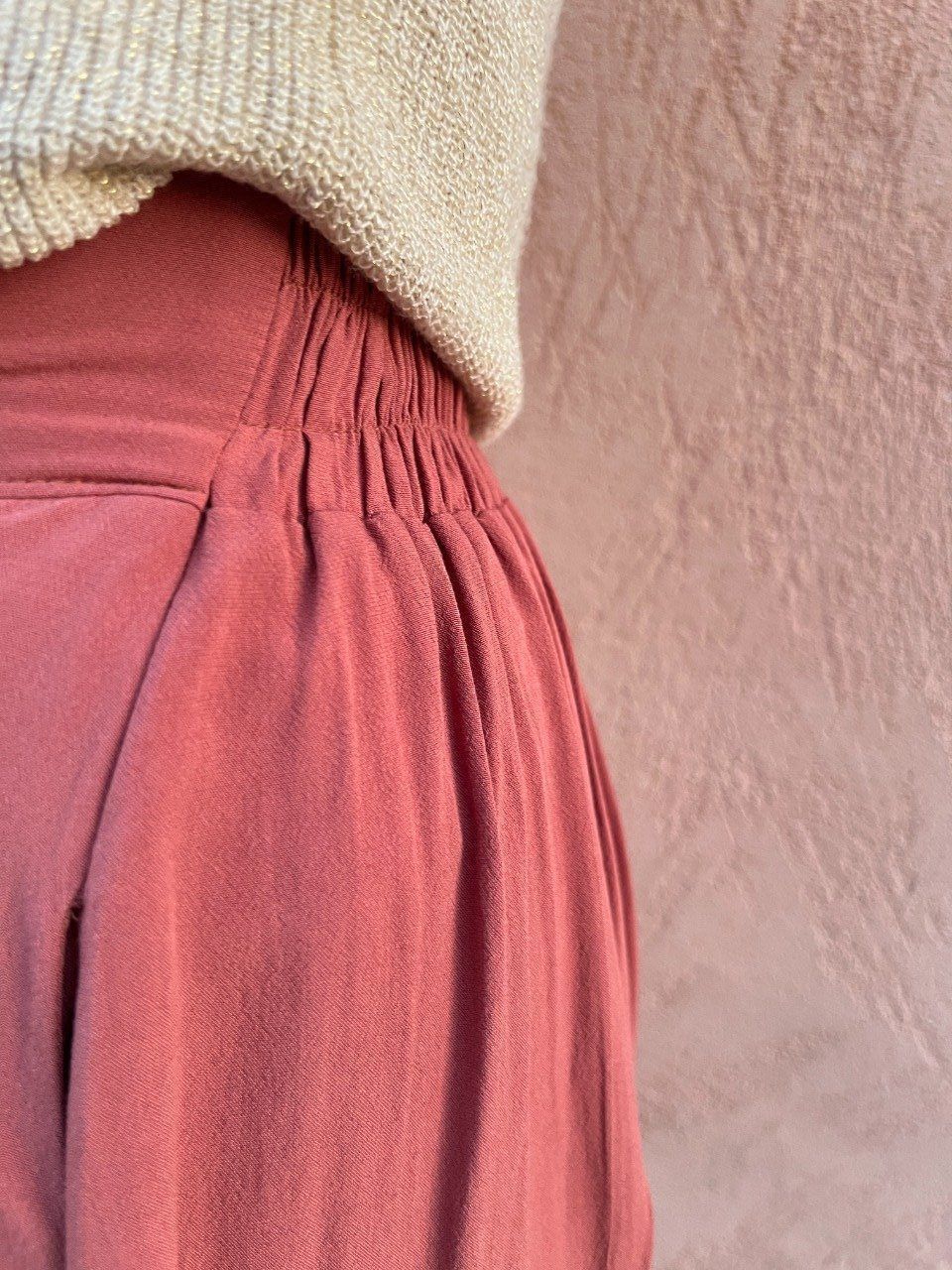 La jupe Eolya se coud dans un tissu fluide et fin comme la viscose, le crêpe, le lin-viscose, le satin de coton, le polyester ... Il y a beaucoup de petites fronces au dos, votre tissu doit être suffisamment fin pour éviter les épaisseurs à cet endroit.