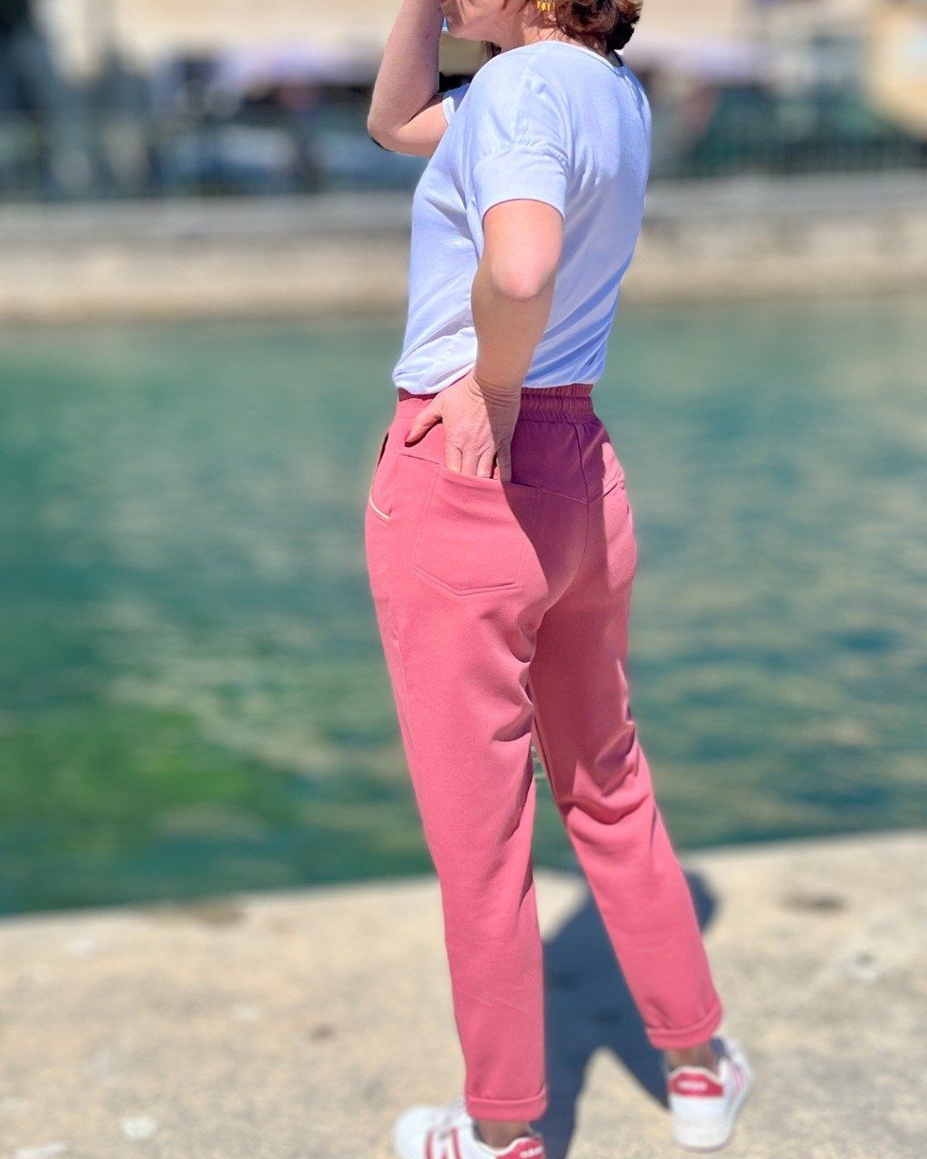 Sprint est un pantalon à l’esprit sportif qui aime également flâner en ville. Sa coupe carotte offre des looks à la fois confortables et élégants, parfaits pour une utilisation quotidienne. Doté d’une taille haute, de hanches ainsi que de cuisses légèrement amples, il garantit une liberté de mouvement optimale tout en conservant une allure moderne. Sa longueur courte à la cheville apporte une touche de dynamisme, idéale pour être assortie avec des baskets ou des talons selon l’occasion. Sa ceinture large permet de personnaliser le style en ajoutant un cordon ou des passants selon vos préférences. Les poches dos glissées dans la couture et surpiquées sont facultatives. Utilisez vos plus beaux tissus jersey stretch et confectionnez le pantalon Sprint qui vous ressemble !