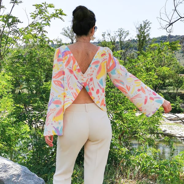 La blouse Papillon est une pièce incroyablement féminine grâce à son dos nu inspiré des ailes majestueuses du papillon. Selon vos envies et le style souhaité, deux versions de dos dénudé s’offrent à vous :