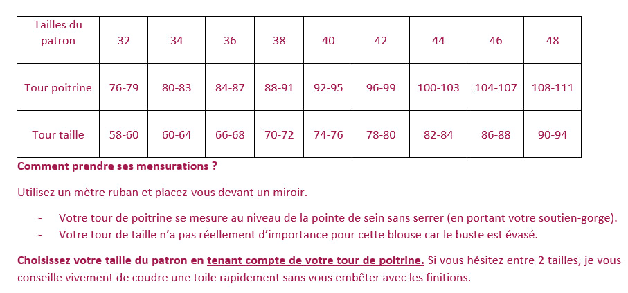 Cette blouse peut être entièrement doublée si votre tissu est ajouré, transparent ou tout simplement pour de jolies finitions. Elle se ferme dans le dos par de jolis nœuds ou des brides avec boutons.