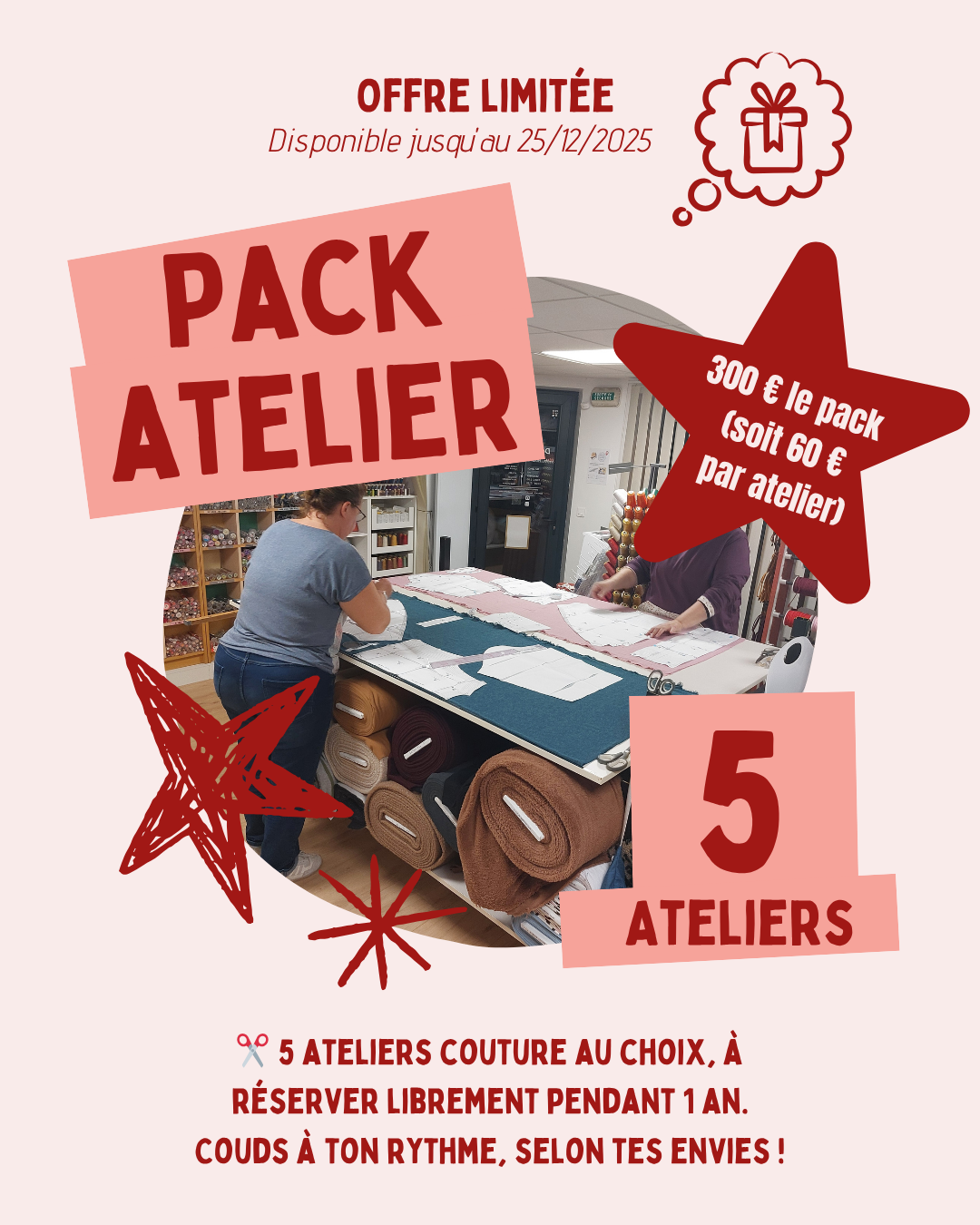 Avec le Pack Atelier, tu profites de 5 séances de couture à réserver librement pendant 1 an, selon ton rythme, tes envies et tes projets.