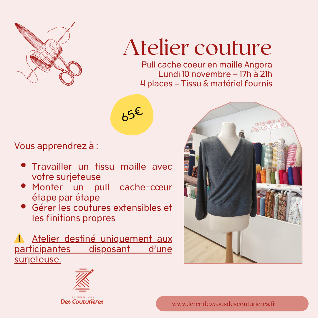 Venez réaliser un pull cache-cœur en maille : une pièce élégante, idéale pour la mi-saison comme pour l’hiver. Durant cet atelier, vous apprendrez à travailler la maille et à dompter votre surjeteuse pour coudre un vêtement souple et bien fini.
