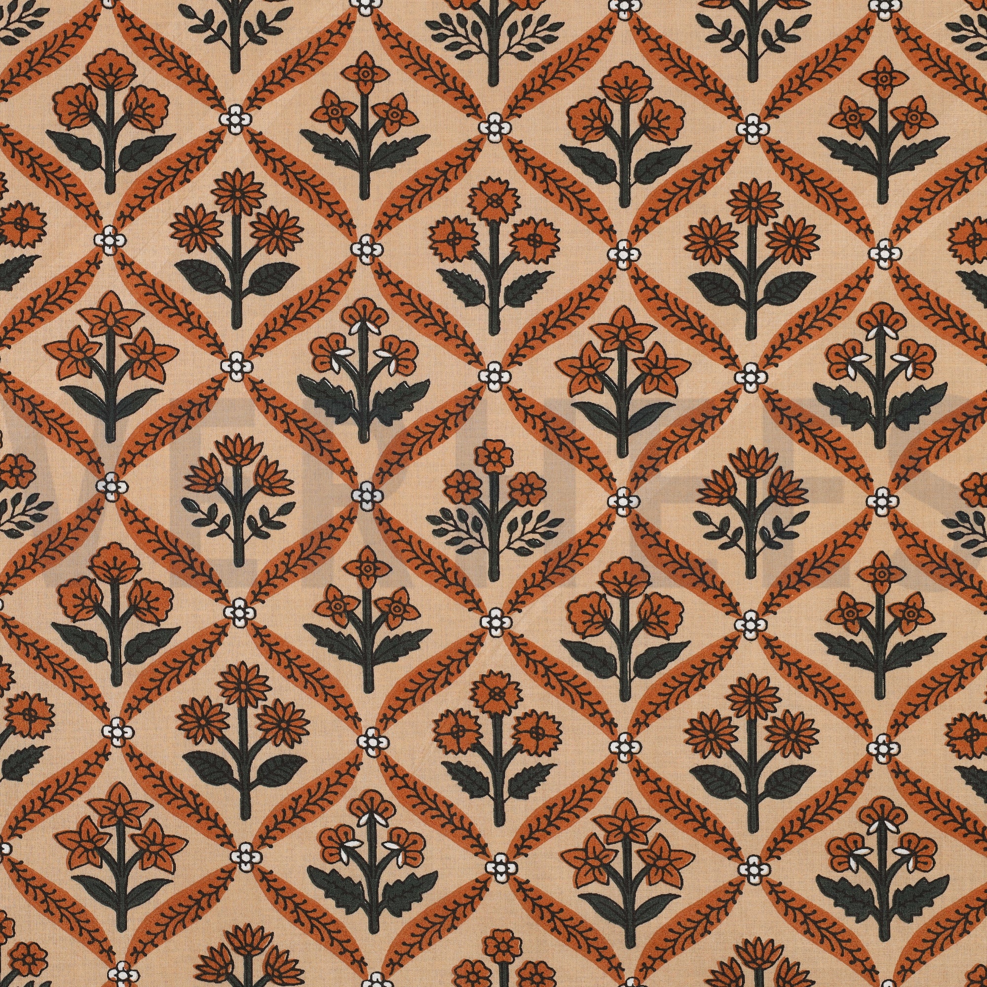 Ce coton imprimé en block print, réalisé selon une technique artisanale, se distingue par son motif fleuri délicat et son fond camel chaleureux. Chaque impression est effectuée à la main, ce qui confère au tissu un charme unique, avec de légères irrégularités qui font tout son caractère.
