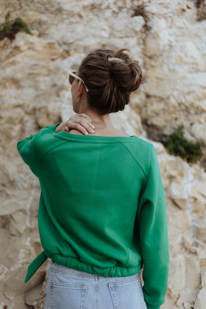 – la Version A prévoit une bande d’ourlet classique, une simple bande de tissu pliée en deux pour terminer l’ourlet du sweat.