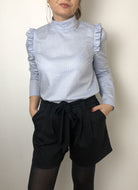 Cette blouse inspire la douceur et le romantisme par son volume tout simplement confort et flatteur, ses petits volants aux emmanchures très féminins et son col simple et chic.