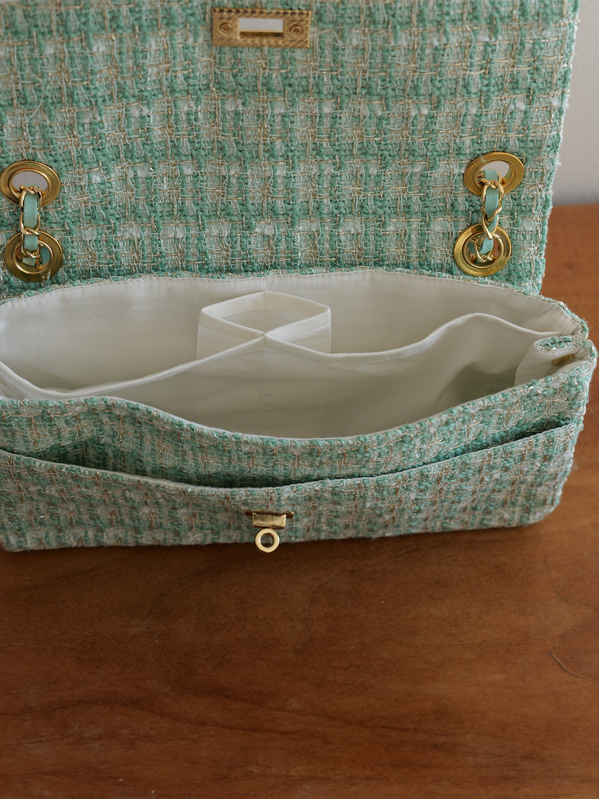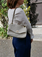 Edgar, c’est le sac classique chic par excellence. Une forme rectangulaire avec un rabat arrondi, un joli fermoir bijou rotatif et une chaîne doublée qui permet de le porter à l’épaule, à la main, ou en bandoulières. Le sac est doublé et comprend une poche plaquée devant, sous le rabat et deux poches intérieures dos.