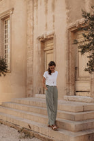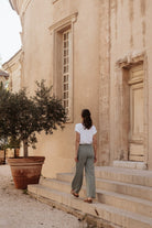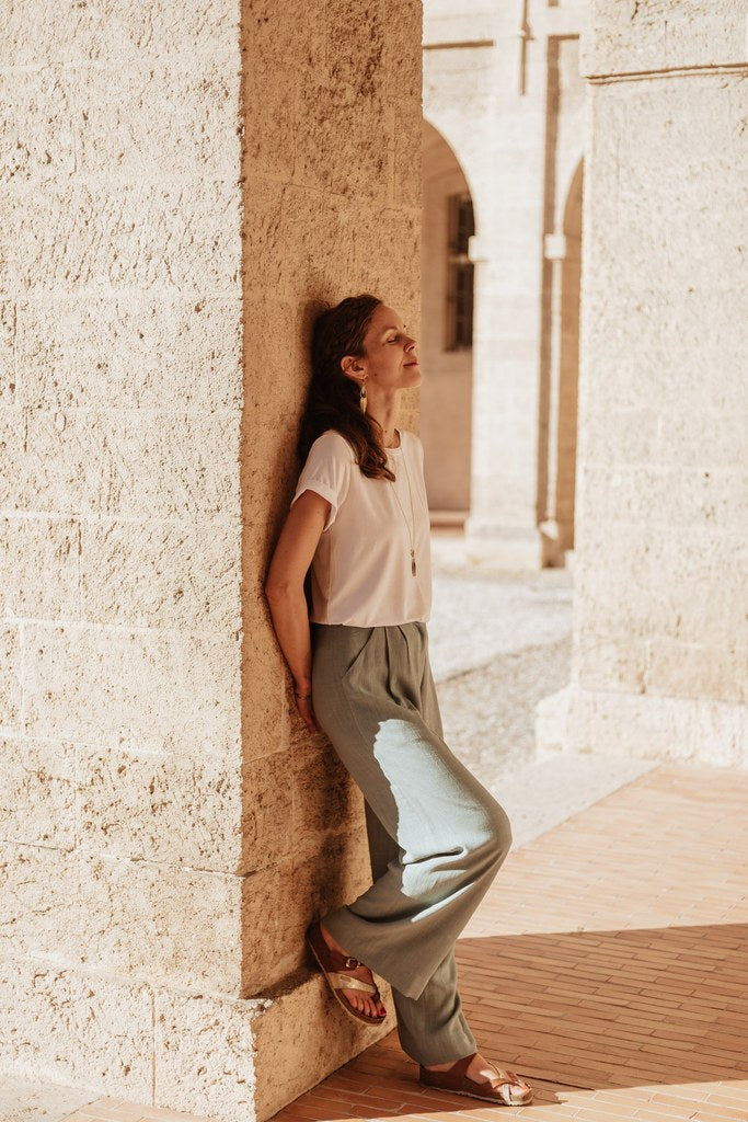 Le Pantalon Dachil est un pantalon large, esprit “palazzo”. Imaginé à l’origine pour ma collection printemps-été 2024, je l’avais pensé comme un pantalon léger, facile à porter, pour se protéger des rayons du soleil ou des moustiques. Toutefois, il s’adapte tout aussi bien à l’automne-hiver lorsqu’il est cousu dans des tissus plus chaud. Extrêmement polyvalent, il n’en reste pas moins un modèle abouti : il dispose d’une véritable braguette, de poches italiennes et de plis savamment placés sur le devant pour mettre en valeur la silhouette. Dans le dos, des pinces viennent galber les fesses pour un seyant optimal.