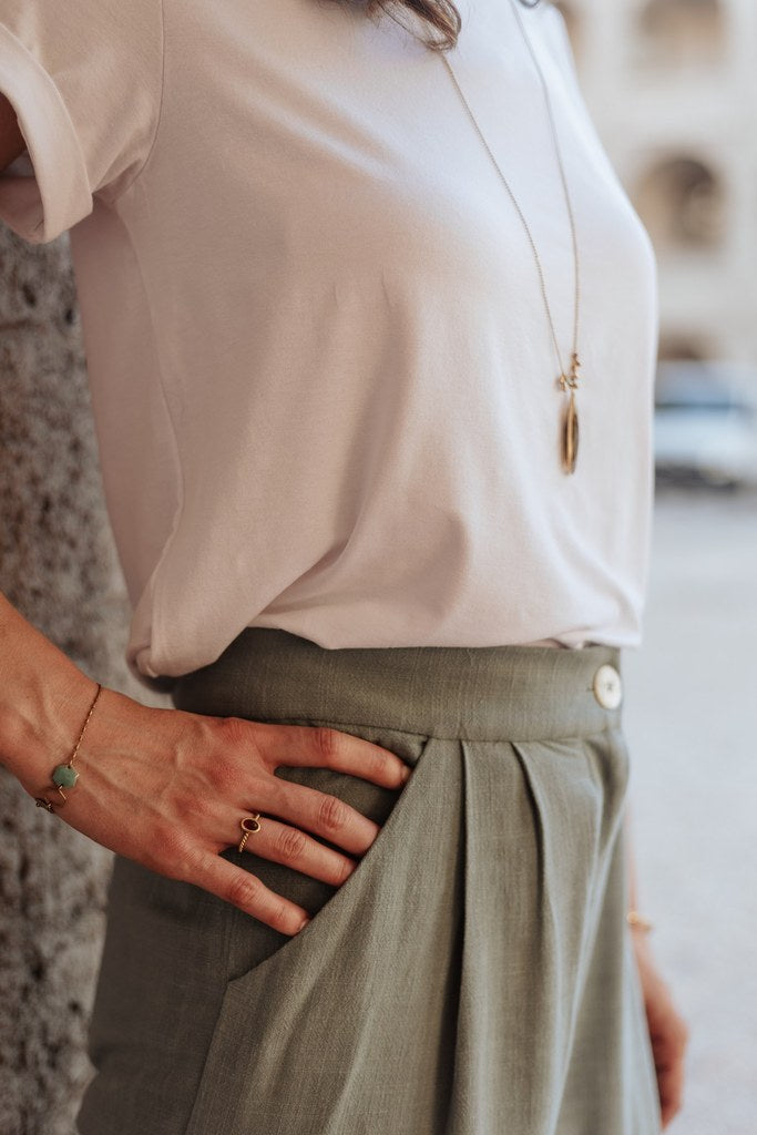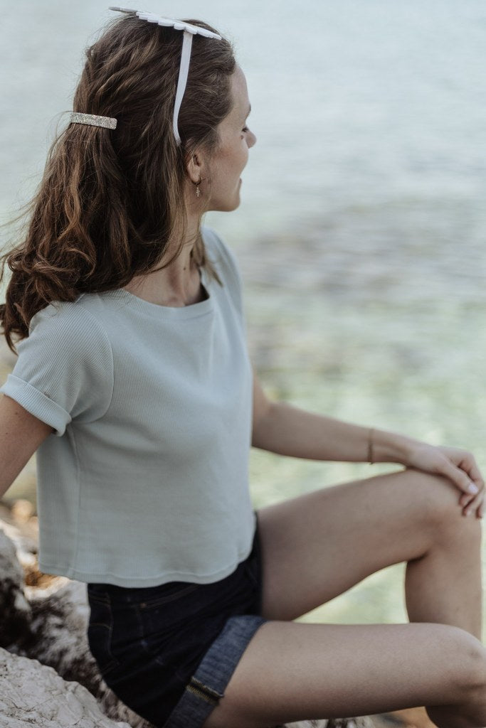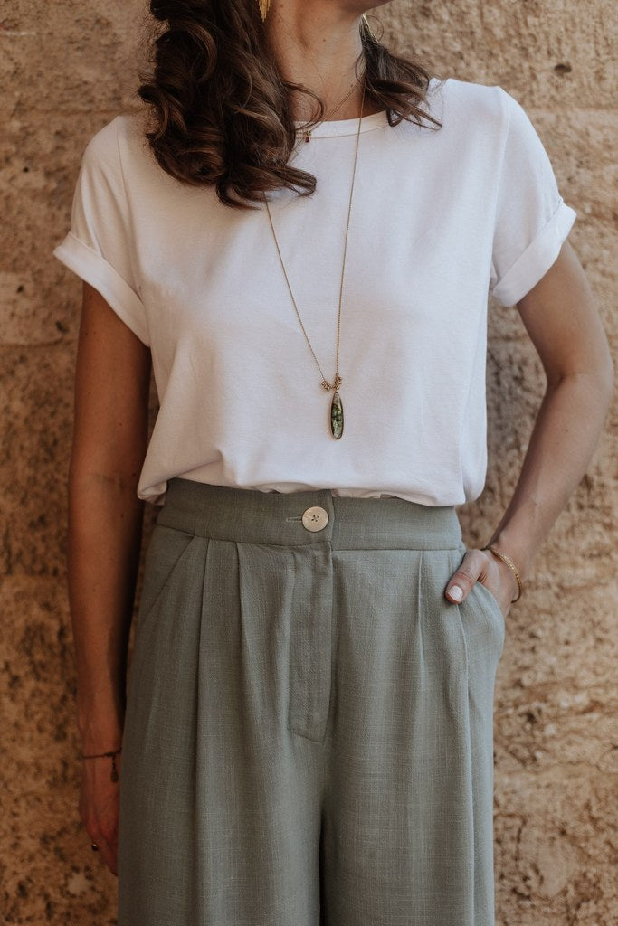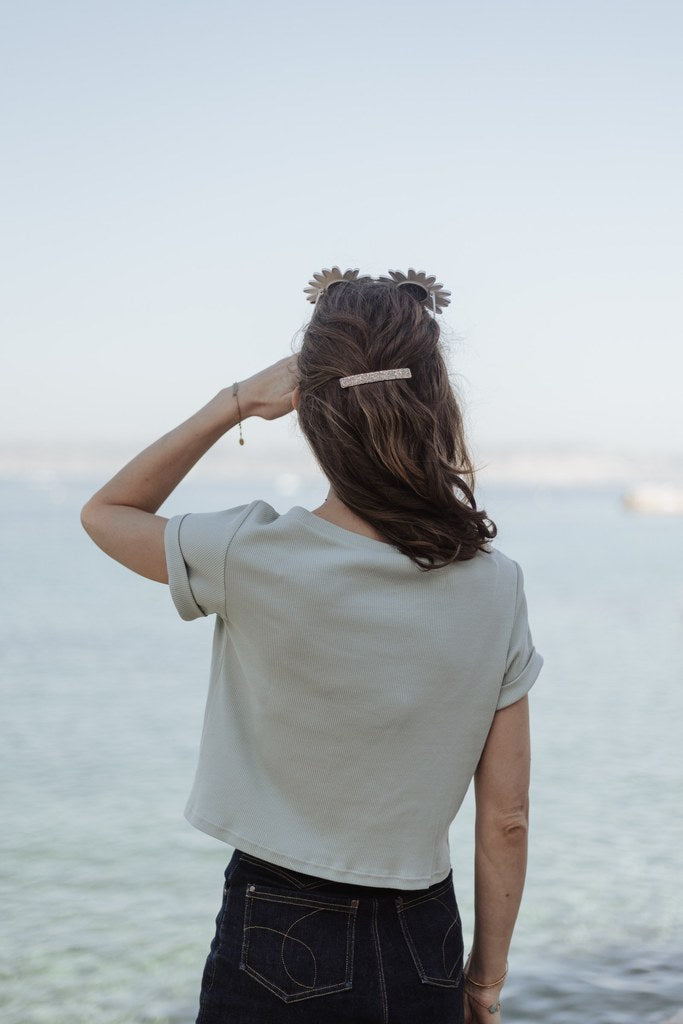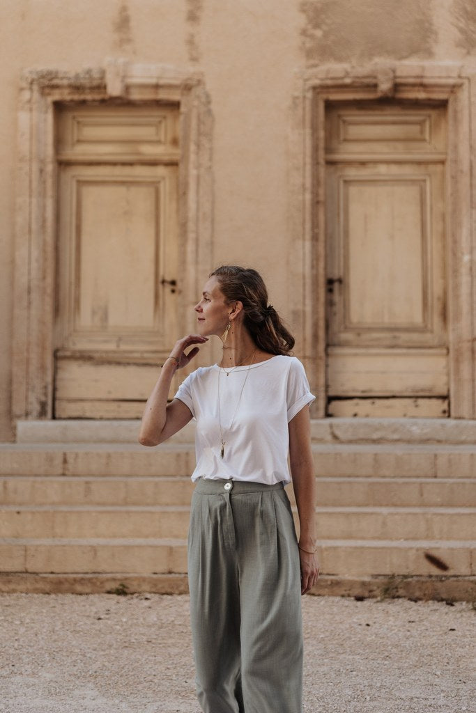 Le Teesh Iban est un tee-shirt ample et confortable, qui se distingue par son encolure haute mais dégagée au niveau des épaules. Ses manches ont été travaillées pour remonter légèrement sur le dessus du bras, et sont habillées d’un revers.