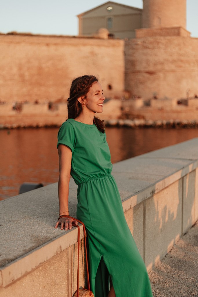 – et la Version C est une robe (longueur chevilles). La version robe est dotée d’une fente de chaque côté pour ajouter de l’aisance à la marche. Elle est également cintrée à la taille à l’aide d’un élastique, pour féminiser la silhouette tout en restant confortable.