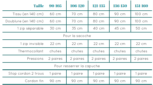 Pour coudre Beira, il vous faudra un tissu extérieur, idéalement déperlant et un tissu doublure confortable à porter. Pour l’extérieur, il est possible d’acheter du matelassé doudoune ou de l’imperméable que vous matelasserez vous-même avec de la ouatine.