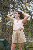 Dans sa version short, optez pour un chambray bleu ciel, à associer avec la blouse Myriam version manche courte dans un crêpe de viscose fleuri, et des sandales à talon !