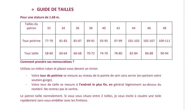 Métrage: Tissu pour une laize de 140 cm : entre 100 cm (manches courtes) et 150 cm selon la version choisie (manches longues).
