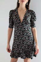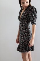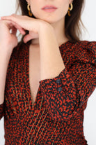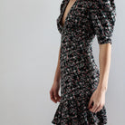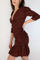 Laurine dans sa version de fêtes combine cet incroyable drapé côté et son volant asymétrique, un joli décolleté plongeant mais recouvrant bien la poitrine ainsi qu’un jeu de plis et de fronces aux manches qui termine de la rendre irrésistible.