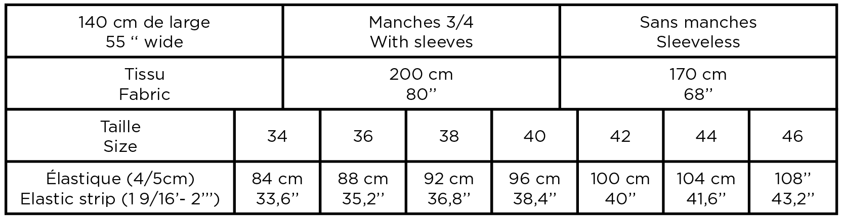 Ce patron s’adapte parfaitement aux matières légères et fluides, mais non transparentes, comme le crêpe de viscose pour un tombé naturel, le satin de soie pour une touche raffinée ou encore un coton pour plus de simplicité. Un jersey de poids moyen peut également être utilisé pour un confort optimal. Poids conseillé 170-250 g/m², 5.01-7.37 oz/yd²