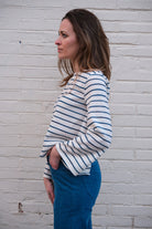 Le pull comporte une encolure bateau, des manches longues évasée et une jolie ouverture au niveau du dos.