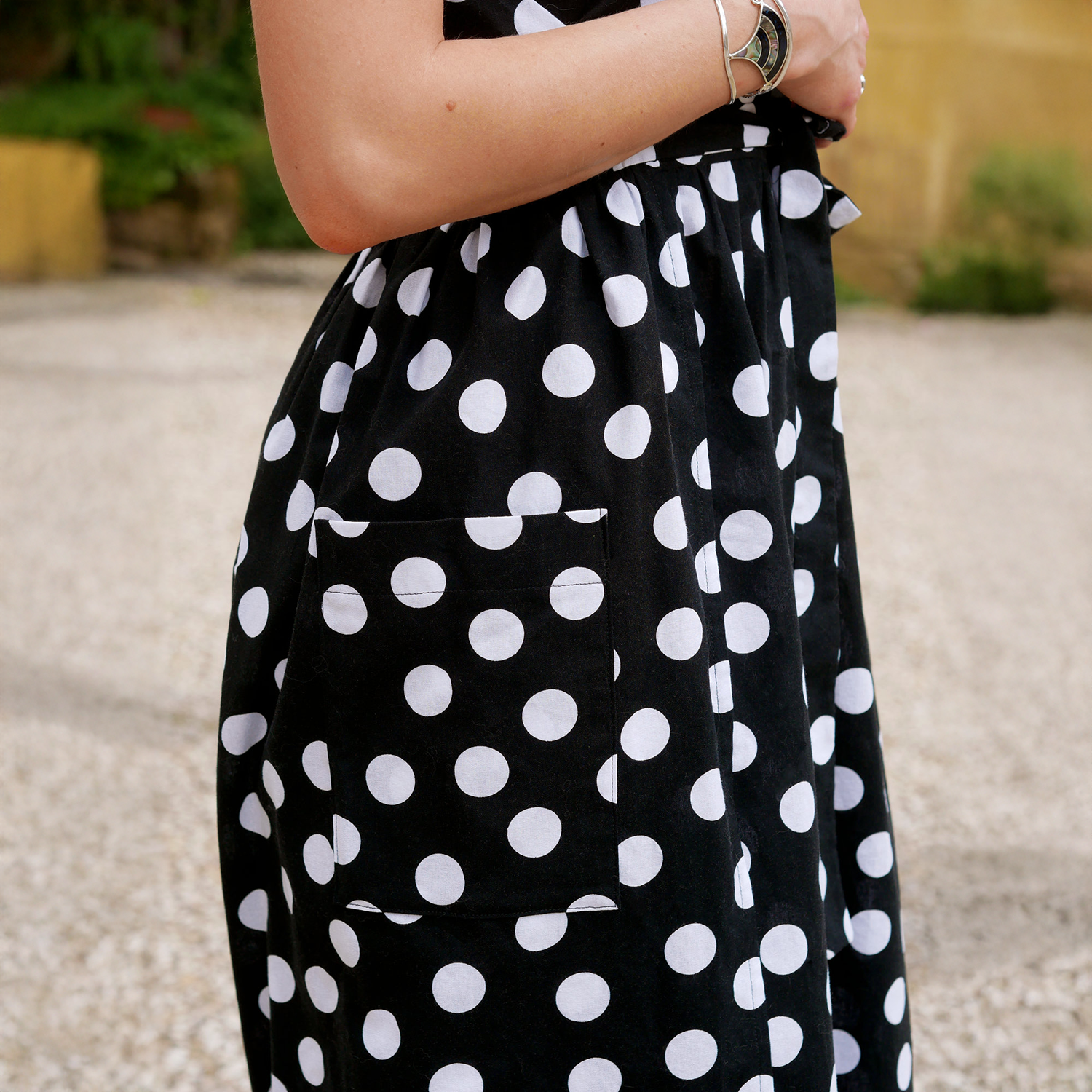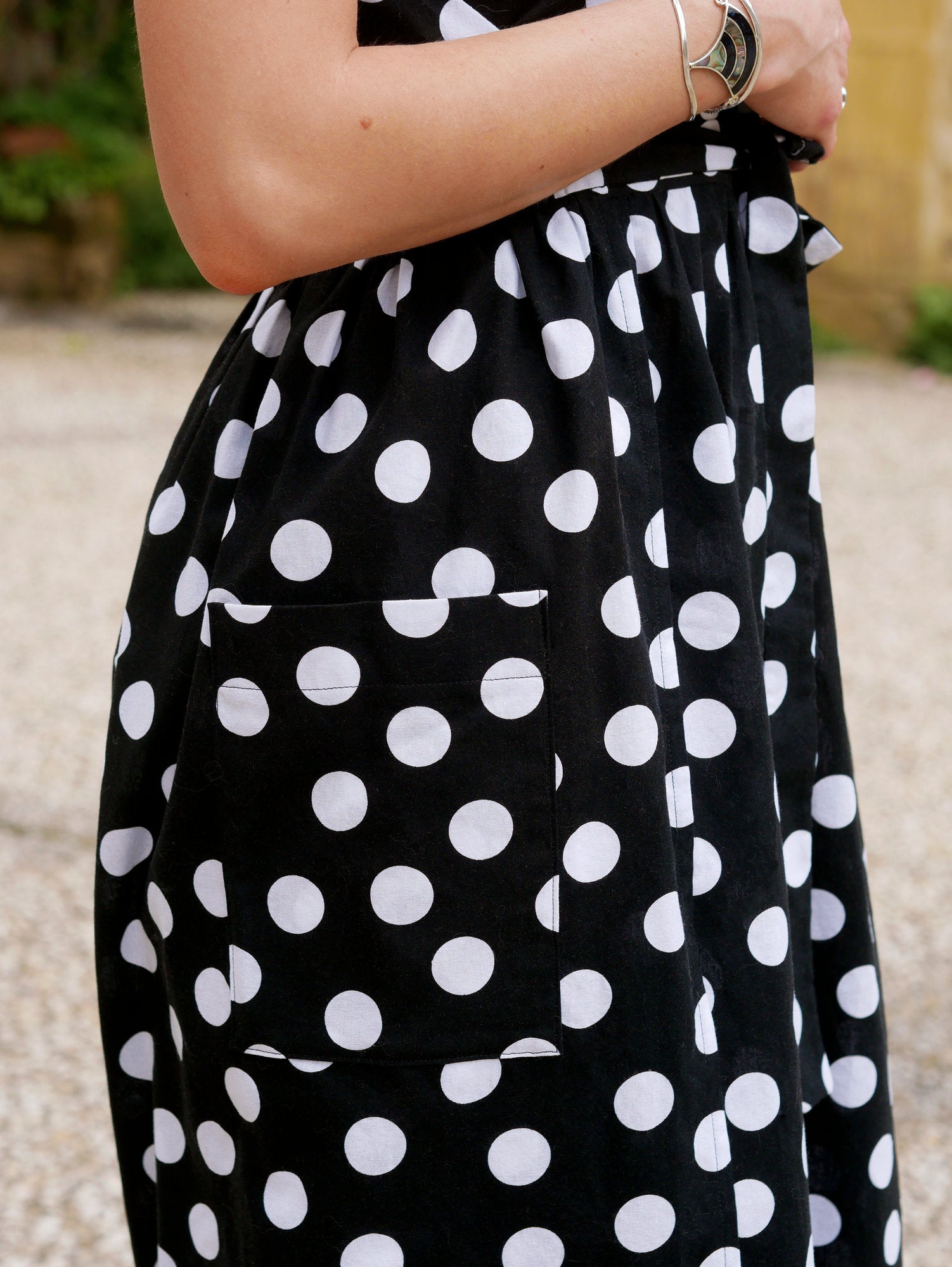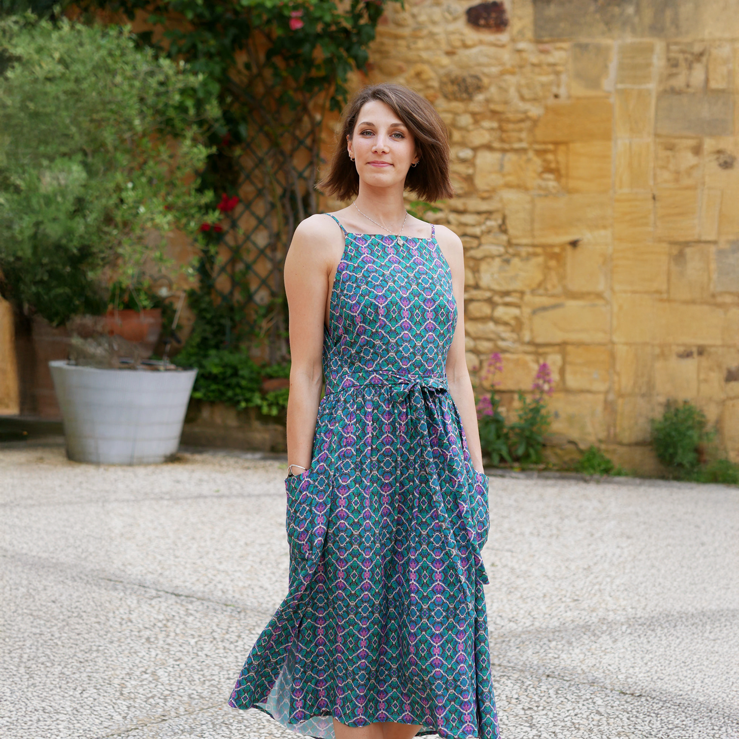 Sa particularité : son attache portefeuille revisitée avec le pan devant s’attachant dans le dos et le pan dos venant s’attacher à la taille avec sa ceinture à nouer, créant au passage, une jolie superposition au bas de l’emmanchure. Son buste structuré par des pinces taille devant et dos et des pinces poitrine, épousera parfaitement les formes du corps, pour un buste qui ne bouge pas. Ses larges poches rectangles sur la jupe viennent parfaire l’originalité de cette robe. Emy peut être réalisée en top en retirant la partie jupe.