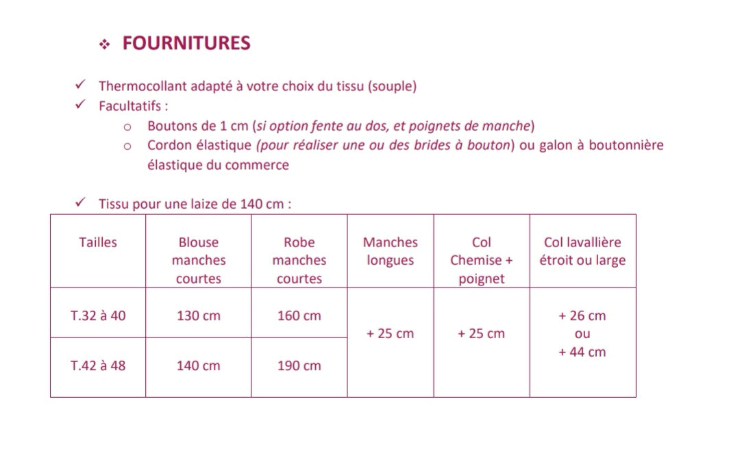 T.40 à 48 : blouse : 140 à 210 cm/ robe : 190 à 260 cm