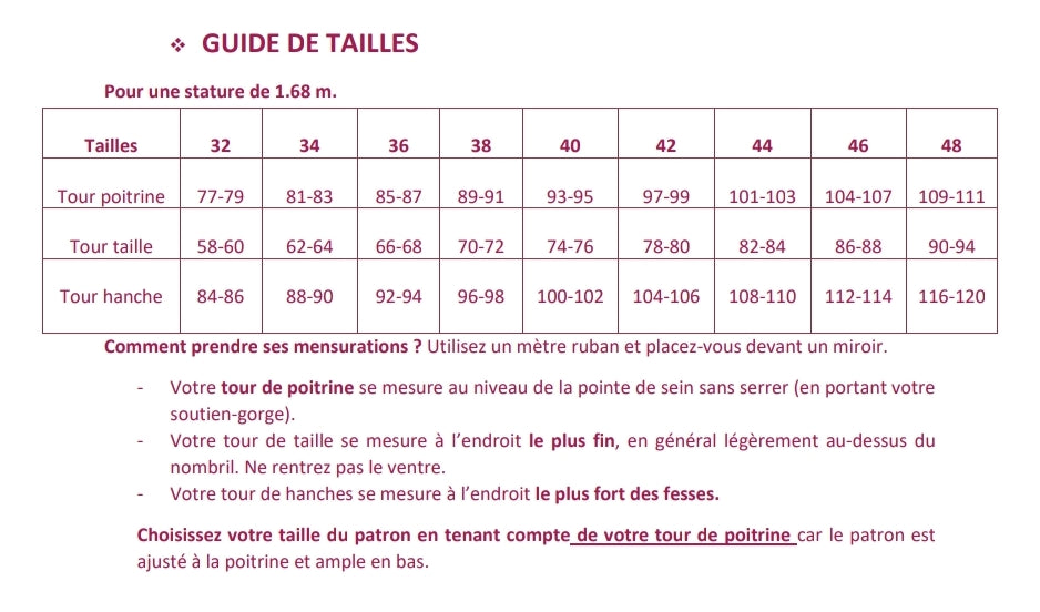 Métrage: Tissu pour une laize de 140 cm pour toutes les tailles 32 à 48