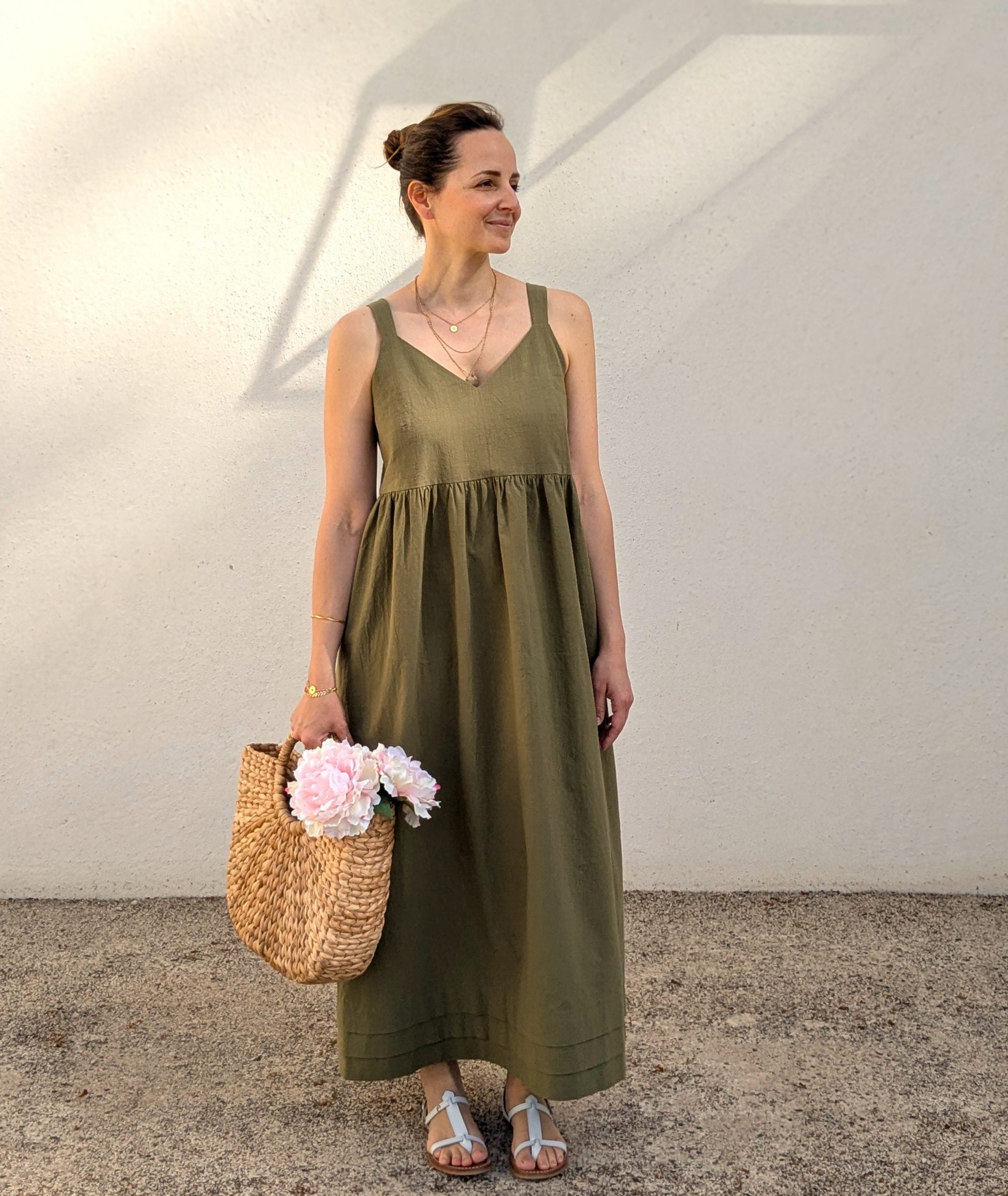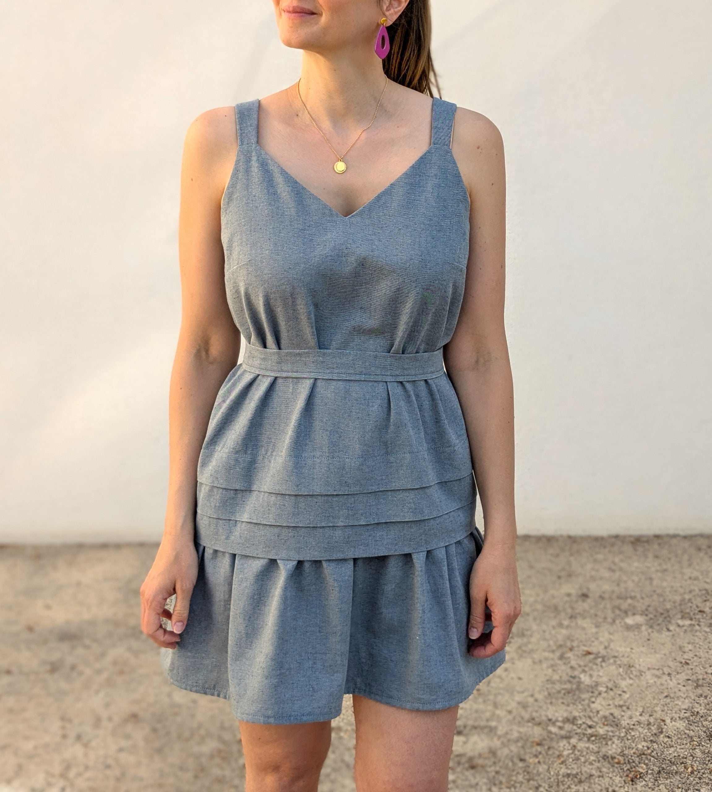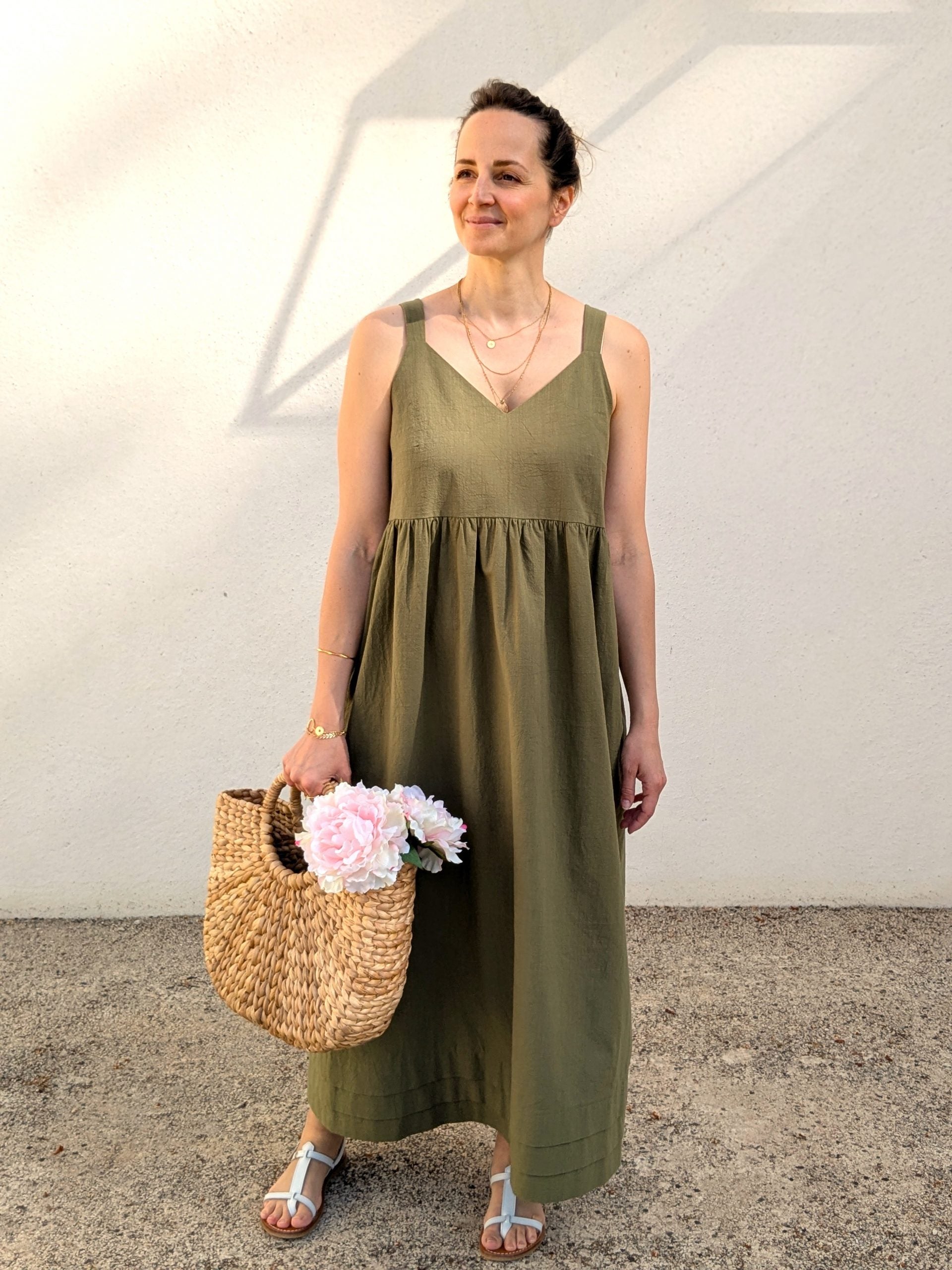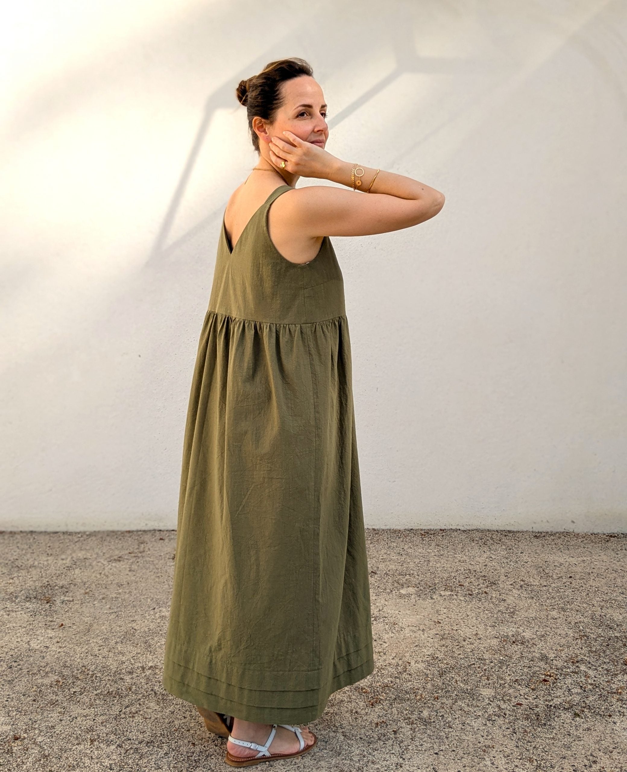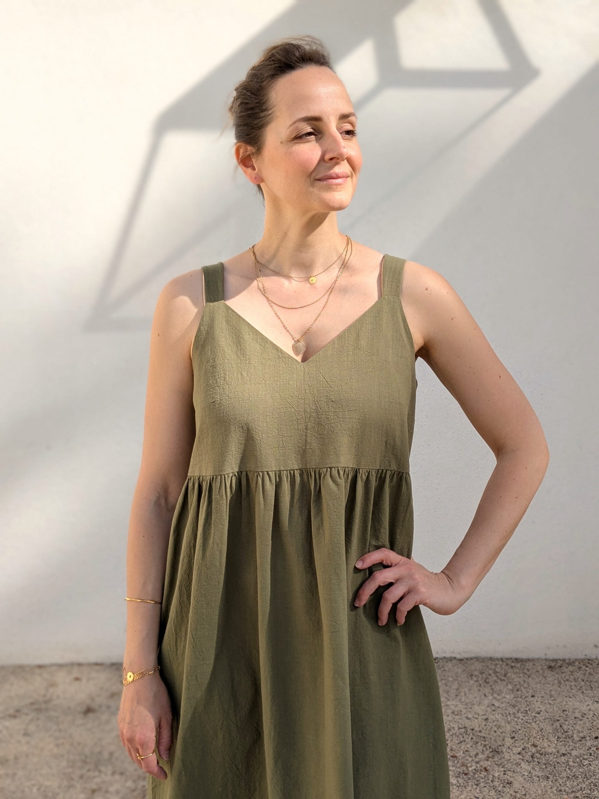La robe Lottus est un modèle résolument estival, avec ses bretelles et ses décolletés V devant et dos finement ajustés. Sa touche la plus créative se révèle au bas du modèle avec une succession de larges plis couchés. Trois versions sont déclinées. Avec la version A, vous pourrez créer une robe droite dans un style épuré. La version B est similaire à la version A, elle se distingue cependant par l’ajout d’un volant froncé à la suite de la zone plissée. Les versions A et B peuvent être portées simplement ou ceinturées. La version C se compose d’un corsage taille empire allongé, associé à des basques froncées. Celles-ci portent les plis couchés – fil rouge du modèle – sur leur bord inférieur. Des pinces poitrine ajustent le modèle pour un tombé plus féminin et les bretelles sont suffisamment larges pour couvrir les bretelles de votre sous-vêtement.