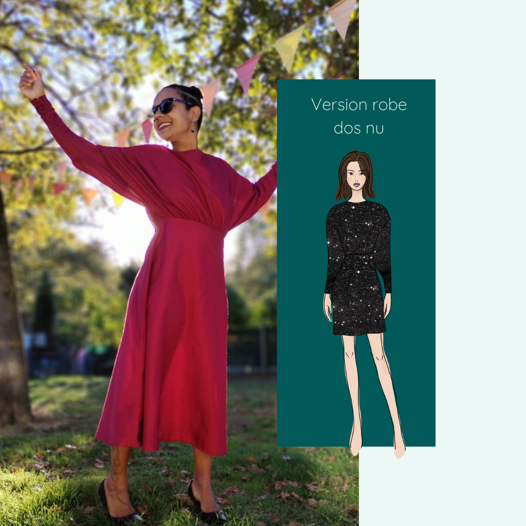 La Robe Manta, c’est LE modèle à coudre pour les fêtes de fin d’année ou encore assister à une cérémonie. Avec son buste au volume généreux, son dos délicieusement dénudé et ses manches chauve-souris, cette robe vous promet de devenir la reine incontestée de la fête.