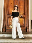 Gino est le pantalon large et fluide très boho chic. Sa coupe large « Wide leg » et sa taille haute cintrée affinent et allongent la silhouette féminine et donnent une allure élancée.